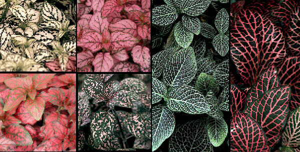 Fittonia.- Se cultiva principalmente F. verschaffeltii y sus variedades. Nativa de la zona andina de Perú, tiene un porte algo rastrero, con hojas redondeadas en los extremos y nerviación contrastante. Se cultivan las siguientes variedades: "Verschaffeltii", con nerviación rojo-rosa. "Pearcei", con nerviación carmín brillante. "Argyroneura", con nerviación blanca. Esta planta, como la anterior, requiere esmero en su cultivo dado su delicadeza.