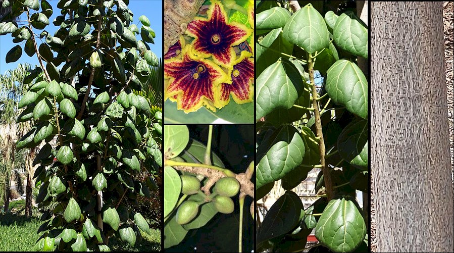 Descripción: Arbolito siempreverde de 6-10 m de altura, monocaule y con un porte estrecho cuando es joven, ramificándose y formando una copa más o menos piramidal o redondeada y densa con el paso de los años, con la corteza marrón grisácea, inicialmente lisa y lenticelada, formándose fisuras longitudinales con los años. Los individuos viejos llegan a formar contrafuertes en la base del tronco. Hojas alternas, ovado-redondeadas, aunque lobuladas en el estado de plántula y juvenil, de 9-18 cm de longitud, con la base acorazonada, con un seno basal formado por dos pequeños lóbulos redondeados que le dan a la hoja apariencia de ser peltada, el margen entero y el ápice redondeado. Son de consistencia coriácea, glabras, de color verde oscuro brillante por el haz y verde más claro mate por el envés, algo enrolladas y con protuberancias entre la nervadura, que es palmeado-pinnada, con 5 nervios principales poco ramificados y que parten de la base, y el resto reticulada. Pecíolo cilíndrico, verde-amarillento, glabro, de 5-10 cm de largo. Inflorescencias en racimos axilares cortos y de pocas flores en la parte superior de las ramas, con frecuencia ocultas por el follaje, con el pedúnculo y los pedicelos puberulentos. Flores apétalas, pequeñas, con un cáliz acampanado de aspecto corolino, amarillo por fuera y rojizo por dentro, dividido casi hasta la mitad en 5 lóbulos triangulares, extendidos, internamente glabrescentes y suavemente tomentosos externamente. Flores masculinas con los estambres con los filamentos unidos en un tubo cilíndrico casi tan largo como el cáliz, coronado por 10 anteras de tecas paralelas formando una hilera circular. Flores femeninas con un ovario globoso, trilocular, con varios óvulos en cada lóculo e igual número de anteras que las masculinas, pero sésiles y situadas en la base del ovario. Estigmas 3, claviforme-espatulados, algo recurvados, glabros. Fruto coriáceo, ovoide, verdoso, con una costilla longitudinal. Cultivo y usos: Arbolito con un follaje muy ornamental que puede utilizarse en alineaciones. Requiere exposición soleada y suelos medianamente fértiles y bien drenados, con aporte de riegos moderados, tolerando bien la sequía y la cercanía a la costa y los vientos marinos. Admite pequeñas podas de formación. Se multiplica por semillas con facilidad, y también por esquejes de ramas delgadas o gruesas, siendo su crecimiento bastante rápido. |