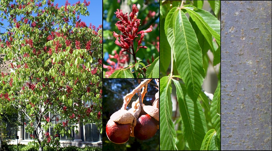 Descripción: Árbol caducifolio de 7-10 m de talla, aunque en cultivo con frecuencia tiene porte arbustivo, con una copa ovalada o redondeada y un tronco simple o, más a menudo, múltiple, con la corteza lisa y grisácea que se va fisurando con el paso de los años. Ramillas gruesas, castaño-rojizas, con marcas de las hojas. Hojas opuestas, palmaticompuestas, con 5 folíolos cortamente peciolulados, lanceolados, obovados u ovados, de 6-15 x 3-6 cm, con la base estrechada o atenuada, el margen doblemente aserrado y el ápice acuminado; son glabros o ligeramente pubescentes en los nervios y de color verde amarillento brillante por el haz, y más pálidos y generalmente tomentosos por el envés. Nervadura con 18-30 pares de nervios laterales paralelos, algo hundidos y espaciados uniformemente por el haz y más resaltados por el envés. Pecíolo de 7-14 cm de longitud, glabro o puberulento. Inflorescencias en panículas terminales estrechas, erectas, de 10-20 cm de largo. Flores de color rojo oscuro, a veces tintadas de amarillo, bisexuales y funcionalmente masculinas en la misma inflorescencia, bracteadas, más o menos horizontales, sobre pedicelos pubescentes de 10-15 mm de largo que se alargan en la fructificación, apareciendo después que las hojas. Cáliz tubular, pubérulo, de color rojo oscuro, de 13-17 mm de longitud, con numerosos nervios paralelos y 5 lóbulos redondeados, desiguales, de 3-4 mm de largo; corola con 4 pétalos oblongo-obovados, redondeados en el ápice, desiguales en longitud, conniventes, con una uña delgada y pubescente de 5-6 mm de largo en su base. Androceo con 7 estambres desiguales, parcialmente exertos, tan largos como los pétalos, con los filamentos tomentosos y las anteras de 2,5-3 mm, anaranjadas. Pistilo de 3-3,5 mm de largo, vestigial en las flores masculinas, con un ovario súpero, fusiforme, tomentoso, con 3 lóculos uniovulados. Fruto en cápsula colgante subgloboso-piriforme, coriácea, lisa pero con irregularidades en su superficie, de 3-5 cm de diámetro, de color marrón claro, dehiscentes por 3 valvas. Semilla de color marrón rojizo brillante, dura, de hasta 2,5 cm de diámetro, venenosa. Cultivo y usos: Gusta de suelos fértiles, húmedos pero bien drenados, ligeramente ácidos, aunque admite neutros o ligeramente alcalinos, con exposición soleada o parcialmente sombreada, especialmente cuando es joven, y aporte de riegos en verano que mantengan la humedad de la tierra, no siendo muy resistente a la sequía. Se multiplica por semillas frescas, y por esquejes con hormonas de enraizamiento. Requiere de una poda de formación si queremos ejemplares con un solo tronco. La especie se cruza con Aesculus hippocastanum, originando el híbrido denominado Aesculus × carnea, y con Aesculus flava, originando el híbrido Aesculus x hybrida. Sus semillas maceradas en agua y mezcladas con harina de trigo eran empleadas por los indios nativos para envenenar a los peces. |