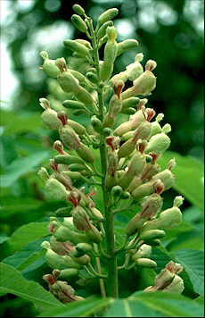 Descripción: Árbol caducifolio de 5-10 m de altura en cultivo, con hojas palmaticompuestas, con 5-7 folíolos obovado-oblongos, de 10-16 cm de largo, acuminados, verdes en el haz y verde-amarillentos en el envés, con pelos en los nervios. Panículas erectas de hasta 20 cm de longitud, con flores de cáliz tubuliforme y corola rojiza o rojo-anaranjada, con los pétalos oblongo-obovados. Fruto en cápsula globosa, lisa, de color castaño claro, de unos 2,5-5 cm de diámetro, conteniendo 1-2 semillas brillantes. Cultivo y usos: Se multiplica por semillas. Requiere exposición soleada o a media sombra y suelos que drenen bien, mejor si son fértiles y algo húmedos. Se utiliza en pequeños grupos por su floración primaveral. |