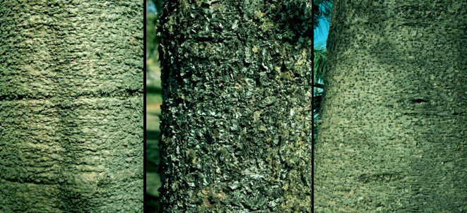 Detalle de las cortezas de Araucaria bidwiliii, Araucaria columnaris y Araucaria heterophylla |