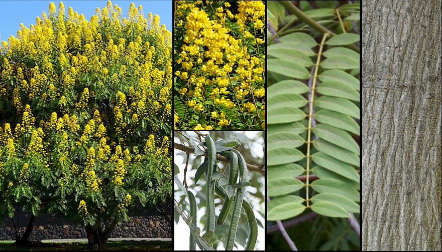 Descripción: Árbol caducifolio o semicaducifolio, de 7-10 (-15) m de altura, con una copa más o menos redondeada o extendida; tronco con tendencia a ramificar a poca altura, con la corteza al principio lisa, grisácea, con marcas horizontales y algunas verrugas, tornándose con los años rugosa y con líneas verticales formadas por grandes lenticelas. Ramillas puberulentas, marrones con lenticelas más claras. Hojas alternas, pinnadas, estipuladas, sin glándula en el pecíolo, de hasta 40 cm de longitud, compuestas por 4-15 pares de folíolos opuestos, de oval-oblongos a lanceolados, de hasta 3-9 x 1-2,5 cm, normalmente decreciendo en tamaño hacia los extremos, con la base redondeada, el margen entero y el ápice agudo o cortamente acuminado; son de textura membranácea, pubérulos o subglabros, a veces pubescentes por el envés, de color verde lustroso por el haz y verde más pálido por el envés; nerviación impresa por el haz y algo sobresaliente por el envés, con 12-22 pares de nervios laterales. Peciólulo de 2-3 mm de largo. Inflorescencias en panículas axilares y terminales ramificadas, de 20-40 cm de largo, portando 12-60 flores olorosas sobre pedicelos velutinosos de 2-3 mm de largo, acompañadas antes de la antesis de 5 brácteas ovado-acuminadas, de 1,5-3,5 mm de largo, pronto caedizas. Cáliz con 5 sépalos ovado-orbiculares, glabros o puberulentos, desiguales, los externos de 3-6 mm de largo y los internos de 6-10 mm de largo. Corola con 5 pétalos amarillos, desiguales en tamaño, estrecha o anchamente obovados, de 2-3,5 cm de longitud, unguiculados. Androceo con 7 estambres más largos y funcionales y 3 más cortos y estériles (estaminodios). Pistilo delgado, con ovario glabro, recurvado, con estilo y estigma diminutos y poco diferenciados. Legumbre cilíndrica o comprimida lateralmente, colgante, de 16-30 x 1-1,2 cm, coriácea, indehiscente, glabra, verde tornándose negruzca en la madurez, conteniendo 50-70 semillas suborbiculares, comprimidas, de color marrón claro, de 5-6 x 3,5-5 mm, separadas por tabiques horizontales membranáceos. Cultivo y usos: Requiere cultivarse en zonas con clima suave y libre de heladas, en una exposición soleada y en suelos bien drenados, mejor si son más o menos neutros y medianamente fértiles, tolerando mal los suelos alcalinos. Tiene un crecimiento rápido y debe ser formado desde temprana edad para proporcionarle una copa bien formada y a la altura adecuada para su uso en calles. Se multiplica por semillas, aunque en Canarias no se les ha observado frutos, las cuales deben ser sometidas a remojo o escarificado antes de la siembra, como las de otras muchas leguminosas; también se multiplica por esquejes leñosos. Su madera es dura y pesada, con alta durabilidad natural y resistencia al ataque de termitas, siendo usada en la fabricación de mangos para herramientas. |