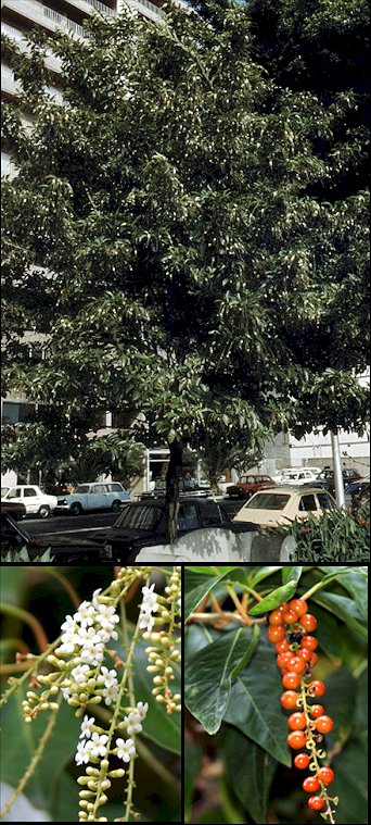 Descripción: Arbolito o arbusto siempreverde o caducifolio, dependiendo del clima, dioico, que puede alcanzar 6-8 (-10) m de altura en cultivo, con una copa estrecha y ramas y ramillas cuadrangulares, grisáceas, glabras, rara vez espinosas. Tronco con la corteza fibrosa, de color castaño claro, que con el tiempo se va fisurando longitudinalmente, quebrándose en pequeñas placas estrechas. Hojas opuestas, decusadas, a veces una de cada par más reducida, de elíptico-oblongas a oblongas, de 4-25 x 1,5-9 cm, con la base aguda y con 1-2 glándulas negras, el margen normalmente entero y el ápice de agudo a cortamente acuminado; son de textura membranácea o cartácea, de color verde vivo brillante por el haz y normalmente más pálidas por el envés, tomando bellas coloraciones algo anaranjadas antes de caer; son glabras en ambas caras o con algunos pelos en los nervios por el envés; nervadura con el nervio central más resaltado por el envés y 5-8 pares de nervios secundarios laterales. Pecíolo delgado, de 0,7-2,4 cm de largo. Inflorescencias en racimos axilares y terminales, arqueados, de 15-30 cm de longitud, poco ramificados. Flores unisexuales, las masculinas y femeninas externamente similares, fragantes, sobre pedicelos glabros muy delgados, de 1,5-4 mm de largo. Cáliz ciatiforme, de 3-4 mm de largo, glabro, con 5 dientes muy pequeños; corola blanca o cremosa, más o menos hipocrateriforme, con el tubo de 4-6 mm de largo, glabro externamente y piloso en el interior a la altura de la garganta; limbo con 5 lóbulos suborbiculares, de 2-3 mm de longitud, redondeados, algo ciliados. Flores masculinas con androceo de 4 estambres insertos en el tubo de la corola, con los filamentos blancos y las anteras marrones, y un ovario estéril. Flores femeninas con estaminodios y un ovario tetralocular, con 1 rudimento en cada cavidad; estilo de 2,5 mm de largo, verde; estigma bilobado, sublateral, verde. Fruto drupáceo, oblongo, de 9-10 x 6-8 mm, carnoso, rojo o anaranjado brillante al principio, tornándose negro en la madurez, acompañado del cáliz acrescente, cupuliforme, anaranjado, de 3-4 x 5-6 mm. Contiene una pulpa mucilaginosa que rodea a las dos nuececillas unidas, cada una con 2 semillas. Cultivo y usos: Arbolito que prospera en la mayoría de suelos si están bien drenados, sean arenosos o arcillosos, con un pH entre 5 y 8, mejor si son fértiles. Requiere exposición soleada o con ligera sombra y climas libres de heladas. Hacia el mes de mayo el follaje toma una bella coloración anaranjada muy ornamental. Su madera es dura y de grano fino, utilizándose en carpintería y, sobre todo, en la fabricación de instrumentos musicales de cuerda. la madera de este árbol es útil para postes de cerca y otro tipo de construcciones toscas en las cuales se necesite de resistencia a las termitas y a la descomposición. Se utiliza como árbol de alineación en zonas cálidas, soportando bastante bien las podas de formación. Se multiplica por semillas y por estacas. |
