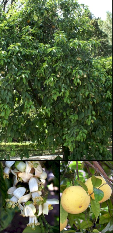 Descripción: Árbol siempreverde de 5-6 m de altura, con una copa más o menos redondeada y un tronco corto de corteza lisa, pardo oscura con líneas verticales blanquecinas; tallos con espinas delgadas y flexibles de 4-5 cm de largo; ramillas jóvenes pubescentes, angulosas. Hojas simples, de anchamente ovadas a elípticas, de 9-16 x 4-8(-10) cm, con la base redondeada, el margen sinuado-crenado y el ápice de redondeado a obtuso. Son de textura gruesa, rugosas, glabras y de color verde oscuro por el haz y más claras y con pelos en los nervios por el envés. Pecíolo anchamente alado, cordiforme, de 2-4 x 0,5-3 cm, algo pubescente. Flores de 3-7 cm de diámetro, aromáticas, blancas, purpúreas en estado de yema, solitarias o en fascículos axilares o subterminales portando 2-10 flores. Poseen un cáliz irregular de 3-5 sépalos pelosos y una corola de 4(-5) pétalos gruesos, de 1,5-3,5 cm de longitud, vueltos hacia atrás en plena floración. Androceo con 20-25(-35) estambres en manojos de 4-5, con filamentos blancos y anteras lineares, amarillas. Ovario globoso con estilo largo y muy grueso. Fruto sobre un grueso pedúnculo, de globoso a anchamente piriforme según variedades, de 10-25 cm de diámetro, de color amarillo pálido o verde amarillento, liso, con un pericarpio grueso y esponjoso con abundantes glándulas oleíferas, conteniendo pocas o numerosas semillas, rugosas y acostilladas, amarillentas, envueltas en una pulpa amarillo-verdosa, rosada o amarillenta, jugosa o algo seca, de sabor un poco agrio, dividida en 11-18 gajos. Cultivo y usos: Se multiplica por semillas y por injertos. Se cultiva por sus frutos, cuya corteza se utiliza en la elaboración de confituras y de ellos se extrae un aceite esencial. Los gajos pelados se consumen en fresco y se usan en la elaboración de ensaladas y postres. Las flores son utilizadas para hacer perfumes. Su dura madera es adecuada para la fabricación de herramientas. En Filipinas y el sudeste asiático tiene diferentes aplicaciones en la medicina tradicional, utilizándose las decocciones de las hojas, flores y corteza por sus efectos sedantes en casos de epilepsia y tos convulsiva. |