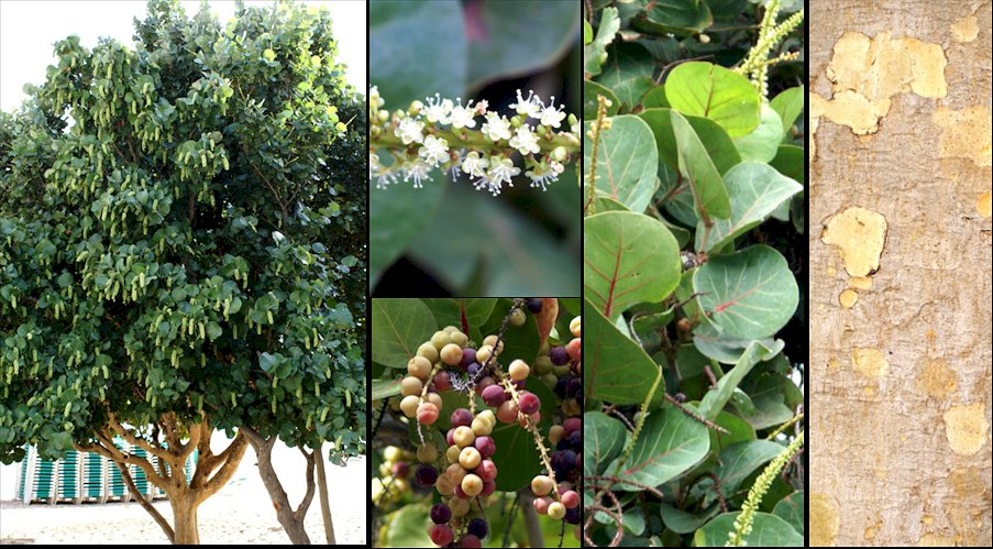 Descripción: Arbusto o arbolito siempreverde, dioico, de 2-9 m de altura, con una copa extendida o redondeada y un tronco a menudo torcido y ramificado a poca altura, con la corteza lisa, grisácea, delgada, pelándose en pequeñas láminas en los troncos grandes, tornándose entonces moteado de manchas de color blanquecino o castaño claro. Ramillas gruesas, redondeadas, verdes, pubescentes o papilosas cuando jóvenes, tornándose grisáceas y con marcas de las hojas con el tiempo. Hojas alternas, de orbiculares a reniformes, de 10-20 x 10-27 cm, con la base de redondeada a anchamente cordada y con uno de los lóbulos sobre el pecíolo, el margen entero y ondulado y el ápice redondeado, truncado o emarginado; son de textura coriácea, glabras, de color verde reluciente por el haz y más claras por el envés, con la nerviación verde-amarillenta o rojiza, prominente en ambas caras, con 3-5 pares de nervios laterales, bifurcados cerca del margen; las hojas nuevas tienen tonalidad rojiza o bronceada. Pecíolo corto, de 6-13 mm de longitud, con una ocrea en su base, rojiza, membranácea, de 3-8 mm de largo. Inflorescencias en racimos terminales y laterales, densos y estrechos, erectos, colgantes al fructificar, de 15-30 cm de longitud, con el raquis puberulento. Flores de hasta 6 mm de diámetro, blanco-verdosas, aromáticas, sobre cortos pedicelos de 1,5-3 mm de largo; las masculinas con un cáliz de 5 lóbulos redondeados, blancos, de 1,5 mm, y un androceo de 8 estambres con filamentos de 4 mm de largo, unidos en la base. Tienen también un pistilo rudimentario. Las flores femeninas son similares a las masculinas pero con un pistilo formado por un ovario unilocular y 3 estilos, además de estambres pequeños y no funcionales. Frutos esféricos o piriformes, carnosos, con el cáliz persistente en el ápice, comestibles pero de sabor ácido y astringente, de 1,2-2 x 0,8-1 cm, verdosos al principio, pasando a purpúreos en la madurez, recordando racimos de uvas. Cada uno encierra una semilla esférica (aquenio) de unos 10 mm de largo, negruzca. Cultivo y usos: Planta tropical que requiere climas suaves y carentes de frío, pues sus grandes hojas se hielan con facilidad, en una exposición soleada o a media sombra y en suelos de diversos tipos. Planta ideal para formar barreras en primera fila frente al mar, pues tolera muy bien la salinidad del aire. Las raíces y la corteza se utilizan en medicina popular contra diarreas y disenterías. La corteza, además, tiene taninos utilizados en curtientes. El fruto se puede comer crudo o en mermeladas, y al fermentar produce una bebida parecida al vino. Se multiplica por semillas, que no deben guardarse mucho tiempo pues pierden poder de germinación, y por esquejes, que deben obtenerse de plantas femeninas para que den los ornamentales frutos. |