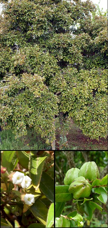 Descripción: Arbusto o arbolito siempreverde, dioico, de 5-8 m de altura, a veces con troncos múltiples, con la corteza lisa, grisácea o negruzca, tornándose rugosa y fisurada verticalmente con los años, muy ramificado y con una copa densa, redondeada o piramidal, con las ramillas jóvenes verdosas o rojizas, cubiertas densamente de pelos finos ferrugíneos. Hojas simples, alternas, dísticas, de estrechamente elípticas a ovado-oblongas o anchamente lanceoladas, de 2-8 x 1-3 cm, con la base atenuada o redondeada, el margen entero, algo ondulado y ciliado con pelos ferrugíneos, y el ápice agudo o subacuminado; son de textura gruesa, glabras y de color verde oscuro brillante por el haz y verde más pálido y mate por el envés, con pelos espaciados en los nervios y en el borde, pubescentes cuando jóvenes, apareciendo ocasionalmente algunas hojas rojizas o anaranjadas que le proporcionan un efecto ornamental al árbol. Nervadura con el nervio medio destacado en ambas caras y hasta 6 pares de nervios laterales más destacados por el envés. Pecíolo pubescente de1-2 mm de largo. Flores funcionalmente unisexuales, actinomorfas, colgantes, olorosas, dispuestas de forma aislada o en pequeños grupos axilares, sobre pedicelos pubescentes de 2-25 mm de largo, acompañados de 2 brácteas foliáceas opuestas, ovado-lanceoladas, de 5-6 mm de largo. Cáliz urceolado, de 5-6 mm de largo, con 5-6 sépalos soldados, cubiertos de pubescencia ferrugínea; corola urceolada o acampanada, blanca o algo cremosa, de 5-12 mm de largo, con 5-6 lóbulos unidos en la base y reflexos en su extremo, pubérulos. Flores masculinas con 10 estambres de filamentos glabros y muy cortos y anteras lanceoladas de 3-4,5 mm de longitud, así como un ovario rudimentario; flores femeninas similares a las masculinas pero con 6-10 estaminodios, glabros o setulosos en el ápice, un ovario súpero, cónico, de unos 2 x 1,5 mm, con 4-6 lóculos, sobre un disco carnoso; estilos 2-3. Fruto en baya subglobosa, carnosa, de 2-2,5 cm de diámetro, rojizo o negruzco en la madurez, rodeado completamente por el cáliz acrescente y papiráceo, inflado, de color castaño-rojizo cuando seco, con 5-6 ángulos o lóbulos, que a menudo permanece largo tiempo en el árbol después de caer el fruto. Semillas 2-4, oblongas, de 7-10 x 5-6 mm, lisas y de color castaño pálido. Cultivo y usos: Árbol propio para climas templados, aunque resiste algo de frío, que gusta de suelos drenados y exposición soleada o con algo de sombra, siendo bastante resistente a la sequía una vez establecido. Un buen árbol para un jardín pequeño, que se multiplica por semillas, que deben escarificarse antes de la siembra. Al ser dioico deben haber ejemplares de los dos sexos para obtener semillas. Tiene un crecimiento relativamente lento, y puede ser cultivado como un seto, empleándose también en las técnicas bonsáis. Sus semillas tostadas han sido utilizadas como sustituto del café, y la corteza y hojas se han utilizado con fines medicinales. Su madera es fuerte y utilizada para mangos de herramientas. |
