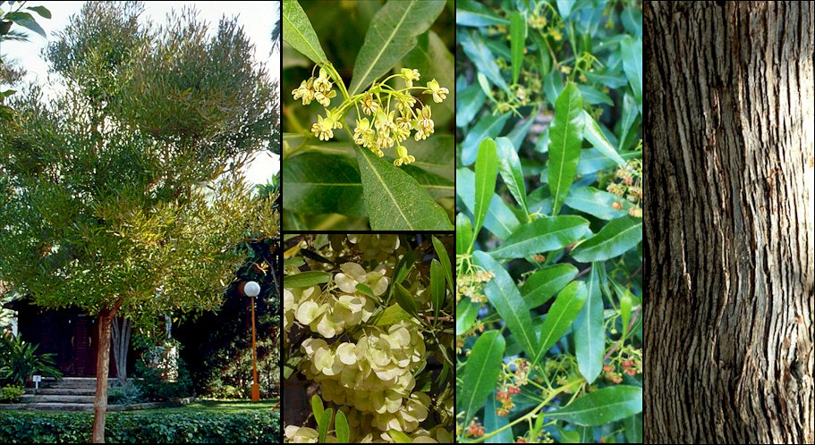 Descripción: arbusto o arbolito siempreverde de 2-3 (-5) m de altura, dioico o polígamo-dioico, con los tallos glabros, rojizos, cuando jóvenes glandulosos, acostillados. Hojas alternas, simples, algo variables, desde oblongo-lanceoladas a linear-lanceoladas o subespatuladas, de 5-12 x 1,5-5 cm, con la base normalmente atenuada en un corto pecíolo, el margen entero y el ápice agudo o redondeado; son glabras, cubiertas densamente de glándulas en ambas superficies, lo que las hace pegajosas al tacto. Pecíolo de 1-5 mm de largo. Inflorescencias en tirsos o cimas axilares o terminales, más cortos que las hojas, sobre un pedúnculo muy corto. Flores unisexuales o bisexuales sobre la misma planta o en plantas diferentes, amarillentas, de unos 5 mm de diámetro, sobre pedicelos de 2-5 mm de longitud, acrescentes en la fructificación, llegando hasta 12 mm de longitud. Cáliz de 4 sépalos libres, ovado-triangulares, de 2-3 mm de largo; corola ausente. Flores masculinas con androceo de (4-) 8 (-12) estambres, con los filamentos muy cortos y las anteras curvadas, de 2-3 mm de largo. Flores femeninas con ovario elipsoide, con 2-3 lóculos; estilo de 4-6 mm de largo, con el ápice lobulado. Fruto en cápsula comprimida, membranácea, de unos 2 x 2 cm, con (2-) 3-4 alas orbiculares, de 4-6 (-10) mm de ancho; semillas 2-4, lenticulares, negras, sin arilo. Cultivo y usos: Se trata de una especie muy variable, y prueba de ello es que se reconocen la subsp. angustifolia (L. f.) J.G. West, la subsp. angustissima (DC.) J.G. West, la subsp. cuneata (Sm.) J.G. West, la subsp. mucronata J.G. West, la subsp. spatulata (Sm.) J.G. West, la subsp. burmanniana (DC.) J.G. West. Es planta frecuente en cultivo, de crecimiento rápido y muy resistente, a veces utilizada para hacer setos. Va bien en zonas próximas a la costa, pues tolera bien la salinidad. En el cultivar ‘Purpurea’ las hojas son purpúreas. Su madera es dura y fuerte, y al parecer muy resistente, con algunos usos locales. También sus hojas tienen aplicaciones medicinales localmente. Se multiplica por semillas. |