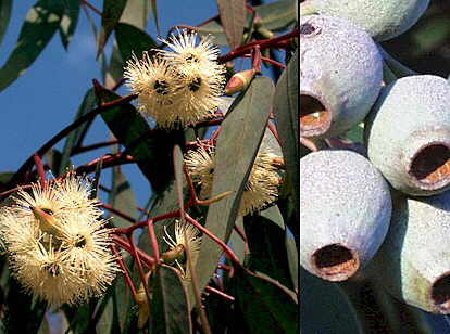 Descripción: Árbol de hasta 35 m de altura en su país de origen, con la corteza lisa, pálida. Hojas adultas alternas, discoloras, lanceoladas, de 10-15 cm de longitud, con los nervios laterales claramente visibles y el pecíolo cuadrangular. Inflorescencias en umbelas de 5-16 flores de color blanco o crema, con el opérculo hemisférico, de 3-4 mm de longitud. Fruto generalmente ovoide, de 1-1,5 cm de longitud, sobre un pedúnculo redondeado. Cultivo y usos: Se multiplica por semillas. Cultivo similar al de otros eucaliptos. Su madera es utilizada en postes y en la construcción. |