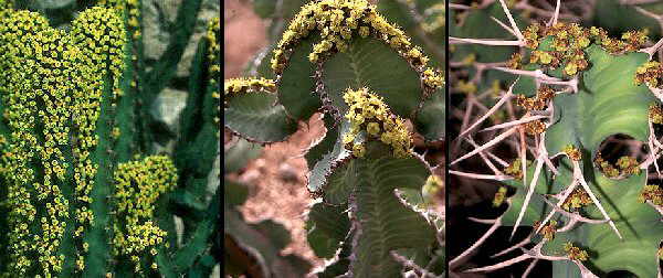 Ciatios producidos alrededor del área central libre y ocasionalmente en la base de los tallos jóvenes. Glándulas nectaríferas amarillo-verdosas |