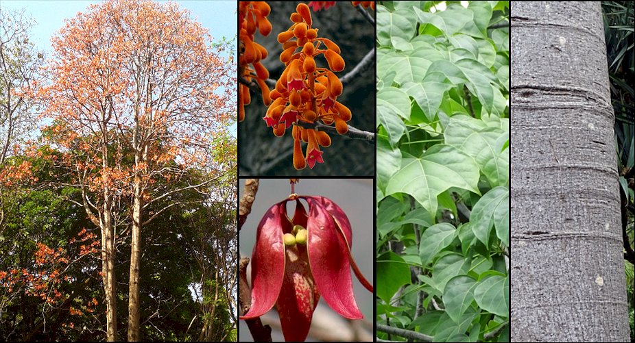 Descripción: Árbol caducifolio de 15-20 m de altura, con una copa estrecha y poco densa y un tronco con contrafuertes, con la corteza lisa o poco agrietada, grisácea o gris-verdosa, y las ramillas gris-verdosas, lenticeladas. Yemas terminales con escamas agudas, ovado-triangulares, con pubescencia ferrugínea, caducas. Hojas alternas, agrupadas hacia el final de las ramillas, palmatilobadas, de 6-25 x 6-20 cm, con la base cordada o subcordada y el ápice con 3-5 lóbulos triangulares, acuminados, el central un poco más largo que los laterales, a veces enteras en árboles adultos; son de textura algo gruesa, de color verde oscuro en el haz y más pálidas por el envés, de jóvenes puberulentas y con pelos estrellados en ambas superficies, luego glabrescentes; nervadura palmatinervia, con 5(-7) nervios basales ligeramente elevados por el haz y más resaltados por el envés, con una reticulación bastante densa. Pecíolo de 7-15 cm de longitud. Inflorescencias en racimos o panículas que brotan en las axilas de las hojas del año anterior, apareciendo normalmente cuando el árbol está sin hojas, sobre gruesos pedúnculos de 6-7 cm de largo, densamente cubiertas de pelos estrellados de color rojo anaranjado. Flores de color escarlata o rojo-anaranjado, de unos 3 cm de largo, sobre pedicelos puberulentos de 4-5 mm de largo, aparentemente bisexuales pero funcionalmente unisexuales, abriéndose primero las masculinas. Cáliz anchamente tubular, ligeramente curvado, con 5 lóbulos ovado-triangulares, agudos, de 3-4 mm de largo, densamente puberulento con pelos estrellados rojo-anaranjados; pétalos ausentes. Androginóforo presente, sobresaliendo del cáliz en la madurez; estambres 10-15, con los filamentos muy cortos, estériles en las flores femeninas; ovario súpero, con 5 lóculos, glabro; estilos 5, libres, cortos; rojos; estigma peltado, rojizo, curvado hacia afuera. Frutos en folículos pedunculados, en grupos de 4-5, rojizos, membranáceos, glabros, en forma de lengua, de 8-11 x 3-5 cm, con 1-2 semillas en los márgenes, rugosas o lisas, globosas u ovoides, de casi 1 cm de largo y aproximadamente 6 mm de diámetro, inicialmente amarillentas. Cultivo y usos: Requiere climas templados, suelos fértiles y bien drenados, exposición soleada y aporte de riegos espaciados, pues tolera bien la sequía. Se multiplica por semillas, que deben ser frescas, teniendo un crecimiento bastante rápido. Las semillas tiernas dicen que tienen sabor a almendras y son comestibles. De su corteza se obtienen fibras y se fabrican cordeles y en algunos lugares la planta tiene usos medicinales contra el cólera, las afecciones diarreicas o las infecciones de orina. Las hojas se utilizan como forraje para el ganado en la India. Su madera es muy blanda, de poco valor y con pocos usos. |