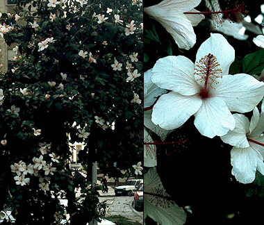 Descripción: Arbusto o arbolillo siempreverde de hasta 4 m de altura, con hojas ovadas, de hasta 25 cm de longitud, acuminadas, enteras o ligeramente dentadas, con 3 nervios más destacados, de consistencia dura, de color verde fuerte. Estípulas caedizas. Flores ligeramente fragantes, solitarias, axilares, sobre pedúnculos articulados cerca de la flor. Epicáliz con 5-7 segmentos de triangulares a lanceolados, de 4-6 mm de largo; cáliz de 1,6-2,4 cm de longitud, tubular, con 5 dientes, rajándose lateralmente en la fructificación. Pétalos de 6-11 cm de longitud, obovado-oblongos o lanceolados, libres, de color blanco, en ocasiones con venas rosadas. Columna estaminal notablemente sobresaliendo a los pétalos, de 10-15 cm de longitud, con los filamentos de los estambres de color rojo. Cápsula alargada, de 1,5-2 cm de longitud. Semillas reniformes. Cultivo