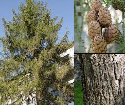 Descripción: Árbol que puede alcanzar 40 m de altura, con la copa cónica y ramificaciones finas, flexibles y colgantes. Corteza marrón-rojiza, profundamente agrietada . Acículas caedizas de 15-35 mm de longitud, de sección triangular y color verde claro. Inflorescencias femeninas de color carmín o frambuesa. Cono ovoide de 2-4 cm de longitud, marrón-rojizo, con escamas delgadas con el borde superior redondeado. Brácteas sobresaliendo entre las escamas, sobre todo en la base del cono. Cultivo y usos: Se multiplica por semillas, con crecimiento moderado y vida larga. Soporta todas las texturas de uelos, desde ligeramente alcalinos a ácidos, aunque soporta regular la sequía. De gran valor por su madera, que es resistente y duradera, indicada para instalaciones a la intemperie. Muy ornamental en jardinería, utilizándose de forma aislada. |