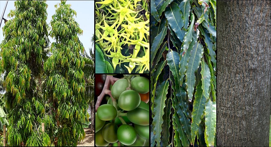 Descripción: Árbol siempreverde que puede alcanzar 15-18(-20) m de altura en condiciones favorables. con una copa columnar muy densa y estrecha y un tronco recto y delgado, con la corteza lisa, de color marrón, con cicatrices de las ramas viejas caídas, oscureciéndose y tornándose costrosa y fisurada verticalmente con los años; ramas brotando a lo largo de todo el tronco llegando hasta el suelo, delgadas y flexibles, zigzagueantes, con las ramillas finamente estriadas, marrones, puberulentas de jóvenes y luego glabras. Hojas alternas, simples, de ovado-oblongas a ovado-lanceoladas o estrechamente lanceoladas, de 12-23 x 2-4,5 cm, con la base cuneada, obtusa o redondeada, el margen entero pero muy ondulado y el ápice alargado y acuminado; son de textura membranosa o cartácea, glabras, de color verde oscuro brillante por el haz y verde más pálido por el envés, con el nervio medio amarillento y destacado y una nervadura secundaria de 18-24 pares de nervios muy finos y poco marcados. Las hojas nuevas tienen un bonito color dorado que poco a poco se va tornando verde. Pecíolo glabro, de 5-10 mm de largo. Inflorescencias axilares, en racemosas y cortamente pedunculadas o umbeliformes y sésiles. Flores bisexuales, amarillentas, sin olor, medio ocultas por el follaje, sobre pedicelos delgados de 2-3 cm de largo. Cáliz con 3 sépalos ovado-triangulares, de 1,5-3 mm de largo, unidos en la base, reflexos, tomentulosos externamente. Corola con 6 pétalos triangular-lanceolados, de 12-18 mm de largo, a veces los 3 exteriores más cortos y estrechos que los 3 interiores, extendidos, puberulentos, agudos en el ápice. Androceo con hasta 50 estambres de 1 mm de largo. Gineceo formado por 20-25 carpelos de 1-1,5 mm, sin estilo y con un estigma oblongo, sésil, pubescente, conteniendo cada carpelo un óvulo. Frutos en monocarpos ovoides de 2-2,5 x 1,5 cm, sobre pedúnculos de 8-10 mm de largo, glabros, de color verde brillante, tornándose amarillentos o rojizos y, más tarde, negros. Se disponen en grupos de 15-20 sobre un pedúnculo leñoso común de 2-3 cm de longitud, cada monocarpo conteniendo una semilla ovoide, de 20 x 1,4 mm, de color castaño claro, lisa y estriada, con un surco central longitudinal. Cultivo y usos: Requiere de un clima tropical o subtropical, libre de heladas, con un suelo suelto y bien drenado, con pH ácido a neutro, soportando periodos de sequía. Gusta de una exposición soleada o con sombra parcial. También soporta la cercanía al mar y resiste bien la contaminación urbana. Se multiplica por semillas, que deben ser frescas, y también por esquejes y acodo aéreo. Posee un crecimiento relativamente rápido, aunque inicialmente puede ser un poco lento. Su madera tiene algunos usos, y en la medicina tradicional hindú diversas partes tiene aplicaciones medicinales. Su principal uso ornamental es como seto o como barrera cortavientos, siendo muy útil para pequeños espacios. |