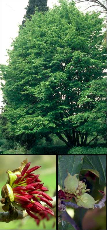 Descripción: Arbolito caducifolio de 5-10 (-15) m de altura, con una copa extendida con las ramas inferiores casi horizontales y un tronco corto, ramificado desde poca altura, a veces múltiple, de corteza lisa de color pardo grisáceo, desprendiéndose en placas irregulares que dejan ver un fondo con tonos amarillos y rosados muy ornamental. Ramillas erectas, lenticeladas, pubescentes. Yemas agudas, pubescentes, de color marrón oscuro o negro purpúreo. Hojas alternas, simples, algo colgantes, de anchamente ovadas o casi redondeadas a obovado-oblongas, de 6-12 x 4-10 cm, con la base redondeada o subcordada, el margen entero y diminutamente crenado-aserrado hacia la mitad superior y el ápice obtuso; son de textura membranácea, con ligera pubescencia de pelos estrellados en ambas caras de jóvenes; su color es verde brillante por el haz y mate y verde más pálido por el envés, frecuentemente matizadas de rojo en los bordes cuando son jóvenes, y tomando bellas coloraciones amarillas anaranjadas y rojizas en el otoño. Nerviación con 6-9 pares de nervios bien marcados a cada lado. Pecíolo de 2-6 mm de longitud, peloso. Inflorescencias en cabezuelas globosas cortamente pedunculadas, axilares, con 3-7 flores bisexuales, apareciendo sobre las ramillas jóvenes antes que las hojas. Brácteas ovado-oblongas, caedizas, las externas marrones y escamosas, las internas membranáceas y verdosas. Flores con un cáliz acampanado de 7-8 lóbulos oblongos muy pequeños, ciliados hacia el ápice; corola ausente; estambres 10-15, con las anteras lineal-oblongas, rojas, siendo la parte llamativa de la flor; ovario semiínfero, bicarpelar; estilos filiformes, simples, recurvados. Fruto en cápsula leñosa erecta, dehiscente por dos valvas, elipsoide, de 1-1,5 cm de longitud, amarillenta o anaranjada, con dos cuernecillos en el ápice, permaneciendo en el árbol bastante tiempo. Semillas ovoide-elipsoides, agudas, amarillentas, de unos 3 mm de largo. Cultivo y usos: Especie muy ornamental cuando llega el otoño, pues las hojas toman tonos anaranjados, amarillos y rojizos. Es bastante resistente a las heladas y sensible al calor, por lo que no gusta de climas cálidos y de veranos calurosos; requiere suelos bien drenados y ligeramente ácidos, tolerando los compactos y adaptándose bien a los algo alcalinos si se le prestan condiciones adecuadas. Exposición algo soleada o mejor con algo de sombra. Admite la poda, aunque requiere de poca para su formación. Se multiplica por semillas, que necesitan estratificación, por esquejes con hormonas de enraizamiento, y por injertos. Tiene un crecimiento algo lento en comparación con otros árboles. Soporta bien la contaminación urbana, siendo interesante para calles y plazas. Su madera es muy dura pero con pocas aplicaciones. |