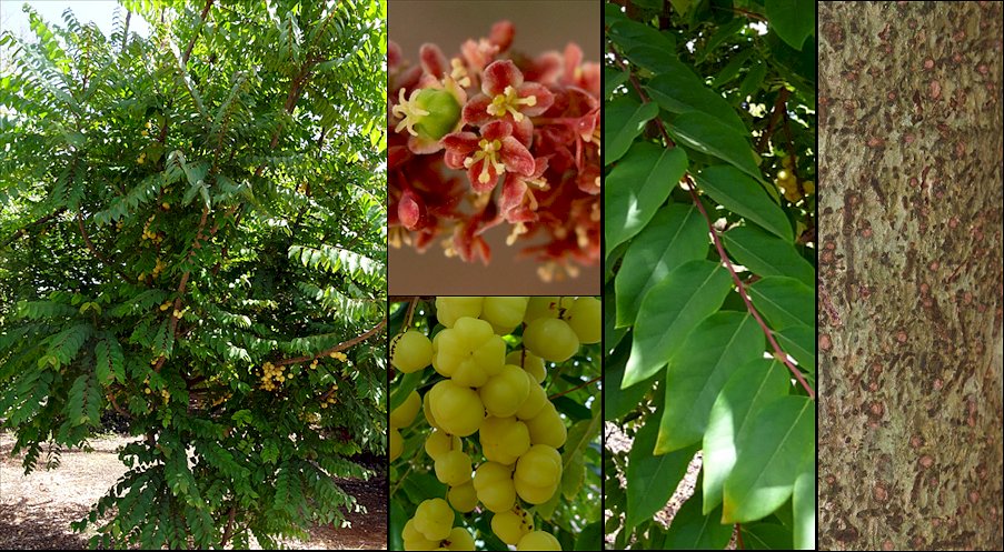 Descripción: Arbusto o arbolito semicaducifolio, monoico, de 2-4(-6) m de altura, con una copa densa y extendida con abundantes ramas gruesas, nudosas y rugosas, hacia el final de las cuales se agrupan las ramillas, que son caducas. Tronco corto y ramificado a poca altura, con la corteza gris verdosa, agrietada y rugosa, con lenticelas. Hojas alternas, estipuladas, dispuestas de forma dística sobre ramillas glabras, a veces rosadas, que miden 15-40 cm de longitud, aparentando ser hojas pinnadas; lámina de ovada a ovado-lanceolada, de 5-9 x 2,5-4,5 cm, con la base obtusa o redondeada, el margen entero y el ápice agudo; son de textura delgada, glabras, de color verde brillante por el haz y verde-azuladas por el envés. Pecíolo de 2-4 mm de largo; nervadura poco destacada. Flores en fascículos axilares densos de 5-12 cm de longitud, en tramos sin hojas de las ramas del año anterior y en la parte superior del tronco, rodeadas por numerosas brácteas membranáceas, castaño-amarillentas, con el margen fimbriado. Las masculinas con 4 sépalos rojizos con el margen rosado o blanco, de 1-1,5 mm de largo, 4 estambres con las anteras amarillas y 4 glándulas nectaríferas extraestaminales; las femeninas con 4 sépalos rosados de 1,2-1,4 mm de largo, un ovario súpero, globoso, trilocular y un nectario anular de 4 lóbulos; estilos 3, connados en la mitad inferior, bífidos en el ápice. Frutos bacciformes, globosos, con 6-8 costillas, de 1-2,5 cm de diámetro, jugosos pero de sabor ácido, de color amarillo pálido, conteniendo un pireno duro y estriado que contiene de 4 a 8 semillas lisas de 3-3,5 mm. Cultivo y usos: Planta que requiere de climas muy suaves, así como suelos mínimamente fértiles y bien drenados, pero que mantengan algo de humedad, y una exposición soleada, siendo, por lo demás, poco exigente y resistente a la sequía. Se multiplica por semillas, pero también es posible por esquejes, por injerto de escudete y por acodos. Se cultiva por sus frutos, que son comestibles pero muy ácidos para comerlos crudos, aunque en algunos lugares se utilizan como saborizantes, siendo utilizados principalmente en jugos y mermeladas, a veces con otras frutas. Su látex, sus hojas y sus raíces tienen propiedades medicinales eméticas y purgativas, y su madera, fuerte y duradera, se utiliza en la fabricación de pequeños utensilios. De su corteza se obtienen taninos. |