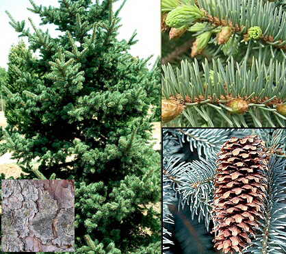 Descripción: Árbol que puede alcanzar 35 m de talla, con la corteza marrón-grisácea, escamosa. Acículas de sección cuadrangular, de 15-30 mm de longitud, punzantes, dispuestas en cepillo, de color verde azulado, muy aromáticas cuando se frotan. Cono colgante, oblongo-cilíndrico, de 6-10 cm de longitud, de color verde cuando joven tornándose marrón claro en la madurez. Escamas plisadas longitudinalmente con el borde superior redondeado e irregularmente denticulado. Cultivo y usos: Se multiplica por semillas y las variedades se injertan. Muy resistente a ambientes contaminados y a condiciones variadas, aunque vegeta mejor en suelos ricos y húmedos y en exposición soleada. Cultivada con fines ornamentales por su follaje contrastante, sobre todo sus cultivares: Argentea, Aurea, Pendula y el más popular de todos, Koster. |