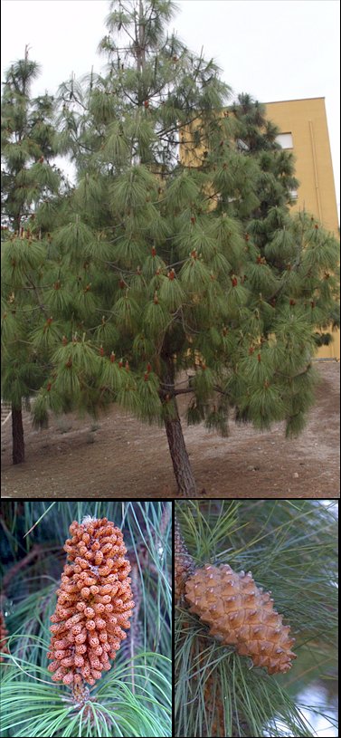 Descripción: Árbol siempreverde, monoico, de 20-30 m de altura, aunque puede medir más en su ambiente natural, con las ramas verticiladas, formando una copa densa y piramidal cuando es joven, abriéndose y tornándose irregular con los años, y un tronco recto y grueso, con la corteza pardo-rojiza, muy fisurada y resquebrajada con los años, formando placas irregulares. Ramillas colgantes, dándole al árbol aspecto un poco llorón. Yemas gruesas, agudas, ovado-cilíndricas, de 1,5-2 cm de largo, no resinosas, con escamas lanceoladas, fimbriadas. Acículas en grupos de 3, las de las plantas jóvenes cortas y azuladas, las adultas delgadas, flexibles y colgantes, de 20-30 cm de longitud y 1-1,5 mm de anchura, de color verde claro, con el margen finamente dentado, agudas en el ápice, con líneas estomáticas en ambas superficies, persistiendo por 2-3 años. Vaina basal persistente, de 1,5-1,8 cm de largo. Suele ser característica la presencia al mismo tiempo de hojas juveniles sobre brotes con hojas adultas, así como brotes juveniles emergiendo directamente del tronco. Conos masculinos de 10-25 mm de largo, amarillo-purpúreos, agrupados en densos racimos amentiformes en el extremo de las ramas. Conos femeninos cortamente pedicelados, ovado-oblongos cuando están cerrados y cónicos una vez abiertos, de 10-20 x 5-11 cm, colgantes, solitarios o en grupos de 2-4. Escamas de 75 a 120, gruesas, de color pardo rojizo en la madurez, con escudete abultado y ombligo saliente pero no punzante. Semillas negruzcas, de 10-15 x 7-8 mm, con un ala membranosa de 12-25 mm de largo. Cultivo y usos: Requiere una exposición soleada, y admite ser cultivado bajo condiciones muy variadas de frío y calor y en suelos de diversa índole, resistiendo muy bien la sequía. A diversas partes de la planta se le atribuyen algunas propiedades medicinales analgésicas, antiasmáticas, o antirreumáticas. Su madera es muy apreciada, porque es resistente, durable e incorruptible, habiéndose empleado en ebanistería, en artesanía diversa y en la talla de esculturas. Tiene interés forestal y maderable, siendo empleado en la construcción, para la fabricación de vigas, pisos, techumbres, balcones, etc., además de su utilización como leña. La pinocha se aprovecha en el ámbito doméstico para la cama de los animales. Se multiplica por semillas. Es atacado por la procesionaria del pino. |
