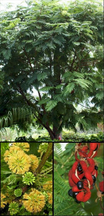 Descripción: Árbol siempreverde que puede alcanzar 15 m de altura y bastante más en sus zonas de origen, con la copa ancha y extendida o redondeada, y el tronco recto y grueso, con la corteza de color castaño oscuro o castaño verdoso claro, lisa o escamosa, que se va fisurando finamente con los años. Ramillas tomentosas, tornándose glabrescentes con el tiempo. Hojas alternas, bipinnadas, de 15-35 cm de longitud, con estípulas caedizas. Pecíolo grueso, tomentoso, de 5-10 cm de largo, con una glándula cerca de su mitad; raquis tomentoso, con una glándula entre cada par de pinnas, que se presentan en número de 8-16 pares opuestos, cada una de 4-11 cm de largo, con 20-40(-60) pares de folíolos opuestos, linear-oblongos o linear-lanceolados, falcados, sésiles, de 8-13 x 3-4 mm, con la base truncada y asimétrica, el margen entero y cortamente ciliado y el ápice agudo; Son de color verde oscuro en el haz y verde amarillentos en el envés, glabros o ligeramente estrigulosos en el nervio medio. Inflorescencias formadas por fascículos axilares de 3-6 capítulos globosos de 2,5-3 cm de diámetro, sobre pedúnculos tomentosos de 3-5 cm de longitud. Flores sésiles, actinomorfas, blanquecinas o verdosas, con el cáliz tubular, rojizo, más o menos glabro, de unos 2 mm de largo, con 5 lóbulos triangulares tomentosos; corola tubular, de 5-8 mm de largo, con 5 lóbulos tomentosos. Androceo con numerosos estambres unidos formando un tubo estaminal de 5-8 mm de largo, con los filamentos blancos en su parte libre y las anteras amarillas. Ovario súpero, unilocular, glabro o pubescente, sésil, de hasta 1,5 mm de longitud; estilo delgado, tan largo como los estambres. Legumbre moniliforme, de 11-20 cm de longitud y 1-1,3 cm de anchura, tardíamente dehiscente, algo carnosa, retorcida, de color rojo brillante, glabra o puberulenta, conteniendo 6-12 semillas de globosas a elipsoides, carnosas, negras, de 15-20 x 12 mm. Cultivo y usos: Árbol de rápido crecimiento que requiere de climas suaves, pues es muy sensible a las heladas, suelos de tipo medio, franco-arenosos, que retengan algo de humedad, neutros o ligeramente ácidos, y una exposición escasamente soleada o a media sombra. Se multiplica por semillas, que deben sembrarse al poco tiempo de ser recogidas porque al parecer mantienen poco tiempo su viabilidad. Requiere cierta poda de formación en los primeros años si deseamos que tenga un tronco recto. Su madera se parece a la del ébano, y es de color castaño rojiza o rojo oscuro, a veces con estrías más oscuras; su dureza es moderada y no es difícil de trabajar, poseyendo gran durabilidad. Se usa para la fabricación de mangos de herramientas, instrumentos musicales, en ebanistería y en construcción en general. |
