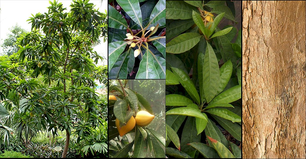 Descripción: Árbol siempreverde de 10-20 m de altura en cultivo, con la copa irregular y el tronco recto, con ramificación simpodial y ramas ascendentes, con la corteza grisácea o pardusca, escamosa y finamente fisurada. Ramillas marrón grisáceas, glabras de adultas, lenticeladas. Hojas alternas, simples, agrupadas en espiral hacia la punta de las ramas, con la lámina de elíptica a oblanceolada, de 10-25(-33) x 3-7(-15) cm, con la base estrechamente atenuada o cuneada, el margen entero y a veces algo ondulado y el ápice de redondeado a acuminado. Pecíolo glabro, de 1-3 cm de largo. Son de textura membranácea, glabras, de color verde claro brillante por el haz y verde amarillentas por el envés, con el nervio central resaltado por el haz y 9-18 pares de nervios secundarios más o menos paralelos. Flores perfumadas, solitarias o en pequeños grupos en las axilas de las hojas, sobre pedicelos pubérulos de 10-15 mm de longitud, verdosas y de pequeño tamaño. Cáliz con 5-6 sépalos verdosos, seríceos externamente, de 4-10 mm de largo, anchamente ovados o redondeados; corola cilíndrica o infundibuliforme, de 7-13 mm de longitud, con 5-7 lóbulos oblongos, imbricados, glabros, blanquecino-verdosos, redondeados o truncados en el ápice. Androceo con 5-7 estambres opositipétalos, unidos parcialmente al tubo corolino, glabros, insertos; estaminodios 5-7, lanceolados, casi tan largos como los estambres. Ovario súpero, ovoide o cónico, pubescente, con 6 lóculos uniovulados; estilo grueso, glabro, exerto; estigma simple o capitado. Los frutos son bayas de subglobosas a elipsoides, algo agudas en el ápice, lisas, glabras, de color amarillo anaranjado, de 7 x 3-5 cm, acompañadas del cáliz persistente; contienen de 1 a 6 semillas elipsoides, negruzcas, lisas y brillantes, de 4 x 2 cm. La pulpa del fruto es comestible y de sabor dulzón, y contiene un látex blanco. Cultivo y usos: Se multiplica por semillas, que pierden pronto su poder de germinación y deben sembrarse lo antes posible, y por injertos. También es posible por estacas de madera dura, aunque son algo lentas de enraizar. Requiere de suelos más o menos neutros, mejor sin son profundos y bien drenados, y de climas suaves, libre de heladas, aportación de riegos y una exposición luminosa o algo sombreada. Tiene un crecimiento bastante rápido. Su fruto, que se produce después de 3-4 años de cultivo, es rico en hidratos de carbono y vitamina C, y se consume crudo en ensaladas y postres. Su madera sirve para la obtención de tablas y vigas para la construcción y también se utiliza en carpintería. |