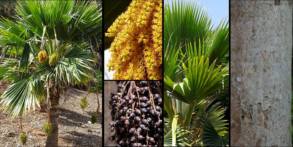Descripción: Palmera de tronco solitario, de 4-5 m de altura y 15-20 cm de diámetro, de color castaño o gris oscuro, con fisuras verticales y anillos estrechos de las marcas de las hojas. Hojas costapalmadas, induplicadas, de 2-3 m de diámetro, formando un semicírculo dividido casi hasta la mitad en 50-70 segmentos ligeramente coriáceos, erectos, bífidos en el ápice, los centrales de 50 cm de largo en la parte libre y 4-4,5 cm de ancho en el punto de separación, estrechándose paulatinamente hacia el ápice; son de color verde brillante con una delgada capa cérea por el haz, y algo glaucos y con diminutas escamas elípticas dispuestas en líneas paralelas por el envés.. El pecíolo y las nervaduras centrales por el envés están cubiertas con un tomento lanoso, gris o blanquecino. El pecíolo aparentemente es algo más corto que la lámina, liso y sin espinas, con la vaina que se descompone en una masa de fibras de color leonado. Las flores nacen en panículas ovadas, densas, de unos 30 cm de largo, con ramificaciones de segundo y tercer orden, dispuestas sobre un pedúnculo de 1,5-2 m de largo que se arquea hacia abajo por debajo del follaje, especialmente en la fructificación. Flores de 5-7 mm de largo, con el perianto amarillo, dispuestas en espiral alrededor de las ramillas, cada una acompañada de una bractéola oblonga diminuta. Cáliz cupular-acampanado, con 3 sépalos de unos 3 mm de largo; corola más larga que el cáliz, con 3 segmentos semiovados de unos 5 mm de largo. Frutos globosos, de 6-7 mm de diámetro, negro-purpúreos en la madurez, coronados por restos de los carpelos y por el estilo persistente y alargado. Semillas esféricas, de unos 4 mm de diámetro. Cultivo y usos: Palmera de cultivo fácil que requiere climas tropicales o subtropicales, una exposición soleada y suelos bien drenados pero con cierta humedad. Tolera muy bien el aire salino. Tiene un crecimiento algo lento. Las deficiencias en hierro y manganeso ocasionan amarilleos del follaje. Requiere de riegos periódicos. Le pueden atacar cochinillas y moscas blancas. Se utiliza de forma aislada o en grupos. Se multiplica por semillas. |