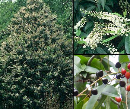 Descripción: Pequeño árbol perennifolio que puede alcanzar 10 m de talla, con la corteza gris-oscura. Hojas simples, ovado-lanceoladas, de 3.5-12.5 cm de longitud y 2-5 cm de anchura, lampiñas por ambas caras, algo coriáceas. Margen festoneado o con dientes mucronados. Haz verde reluciente y envés más pálido y glauco. Pecíolo de 1.5-2.5 cm de longitud. Flores blancas de unos 8 mm de diámetro, reunidas en racimos axilares de 15-25 cm de longitud, más largos que las hojas. Aparecen alrededor de Junio y no son olorosas. Fruto ovoideo de unos 8 mm de diámetro, lampiño, primero verdoso y después púrpura-negruzco en la madurez, sobre corto pedúnculo. Hueso liso. Cultivo y usos: En Canarias está presente la ssp. hixa (Willd.) Franco = Laurocerasus lusitanica ssp. hixa (Willd.) G. Kunkel. Su madera es rosada y se emplea en ebanistería. Existen algunos cultivares hortícolas: Angustifolia, Myrtifolia, Variegata. |