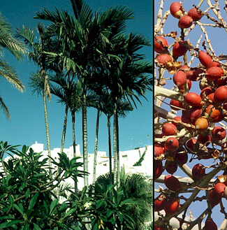 Descripción: Palmera monoica de tronco liso y anillado, de hasta 8 m. de altura y 8-12 cm. de grosor. Hojas pinnadas de 1-2 m. de longitud, con 20 pares de folíolos de 40-50 cm. de longitud, con el ápice truncado oblicuamente y dentado, de color verde brillante. Inflorescencia que sale de debajo del capitel, con flores blanquecinas, olorosas. Fruto globoso, rojizo. Cultivo y usos: Se multiplica por semillas, que tardan 3-5 meses en germinar. Requieren suelos fértiles y bien drenados y una exposición al sol o a media sombra. |