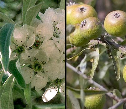Descripción: Pequeño árbol caducifolio que puede alcanzar 10 m de talla, con ramas más o menos horizontales y ramillas colgantes. Hojas simples de 3,5-9 cm de longitud, estrechamente lanceoladas, acuminadas, con márgenes enteros. Haz verde brillante y envés verde plateado y tomentoso. Flores blancas de unos 2 cm de diámetro dispuestas en pequeños corimbos redondeados. Aparecen al tiempo que las hojas. Fruto de forma de pera de 2,5-3 cm de longitud, de color marrón cuando madura, sobre un pedicelo blanco lanoso. Cultivo y usos: Se multiplica por semillas, que necesitan varios meses de estratificación fría. Las variedades se injertan. Tolera suelos de ácidos a alcalinos. Se utiliza como ornamental sobre todo el cultivar Pendula. De lejos a veces nos recuerda al follaje de Elaeagnus angustifolia. |
