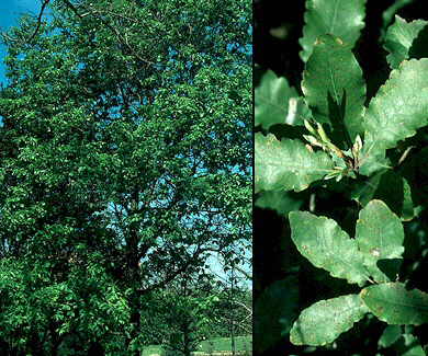Descripción: Árbol que puede alcanzar 20 m de talla, con la corteza grisáceo-pardusca o pardusca, muy rugosa, con grietas superficiales. Hojas alternas, marcescentes, a veces subpersistentes, coriáceas, ovadas, elípticas, trasovado-oblongas o lanceoladas, acorazonadas o atenuadas en la base, de 3-11 cm de longitud y 1.5-8 cm de anchura. Márgenes festoneados, dentados o lobulados, a veces con dientes agudos triangulares. Haz verde lustroso, glabrescente, y envés con tomento grisáceo, amarillento o blanquecino. 6-12 pares de nerviaciones. Pecíolo tomentoso de 4-20 mm de longitud. Amentos masculinos en grupos de 4-5. Flores femeninas generalmente en grupos sobre un corto pedúnculo. Bellotas cilíndricas de 1.5-3.5 cm de longitud, habitualmente en grupos, colocadas en medio de las hojas. Cúpula de escamas ovado-triangulares, aplicadas, tomentosas, que cubre a la bellota de un tercio a un quinto. Maduración anual. Cultivo y usos: Su madera se ha empleado como combustible. Sus hojas y frutos son aprovechados por el ganado. |
