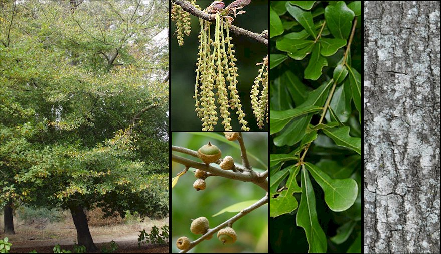 Descripción: Árbol caducifolio, monoico, que puede alcanzar 20-25 m de altura en su lugar de origen, con la copa redondeada y extendida, simétrica, con abundante ramaje; ramillas delgadas, glabras, diminutamente lenticeladas, al principio rojizas, pasando luego de color gris castaño. Tronco con la corteza lisa y de color castaño claro, tornándose fisurada y oscura con los años. Hojas alternas, de oblongo-obovadas a cuneiformes, de 4-13 x 2-5 cm, más anchas en la mitad superior, estrechándose gradualmente en una base cuneada, enteras y con el borde ondulado o ligeramente trilobadas hacia el ápice, especialmente las hojas jóvenes y las más sombreadas, con los lóbulos agudos, acuminados o redondeados, ocasionalmente pinnatífidas en su mitad superior; al abrir son de color verde claro con tintes rojizos, finamente pubescentes, tornándose al madurar glabras y de color verde oscuro en el haz, y más pálidas y con algunos pelos en las axilas de los nervios por el envés; en el otoño se tornan amarillentas. Pecíolo recio, achatado, de 3-12 mm de longitud. Flores masculinas dispuestas en amentos colgantes, rojizos, pelosos, de 5-7 cm de largo, con el cáliz delgado y escarioso, dividido en 4-5 segmentos ovado-redondeados y 4-5 estambres de anteras amarillas; flores femeninas solitarias o en grupitos axilares, sobre cortos pedúnculos tomentosos, con un involucro de brácteas igualmente tomentosas, algo más cortas que los lóbulos del cáliz, y estigmas reflexos, rojizos. Bellotas generalmente solitarias, sésiles o cortamente pedunculadas, de 1-1,5 cm de diámetro con un aquenio redondeado y ancho, rodeado en la base o hasta una tercera parte de su longitud por una cúpula en forma de tacita, con escamas ovadas, agudas, muy apretadas, de color castaño-rojizo claro, algo pubescentes. Maduran al segundo año. Cultivo y usos: Es un árbol de facil trasplante y de rápido crecimiento, aunque de vida relativamente corta, que requiere una exposición soleada o a media sombra y suelos bien drenados, neutros o ligeramente ácidos, no salinos, resistiendo bien la sequía. Se multiplica por semillas y por estacas de madera dura. Necesita algunas podas de formación en los primeros años de su vida. Su madera es pesada, fuerte, dura y de grano denso, de color castaño claro, empleándose como combustible. |
