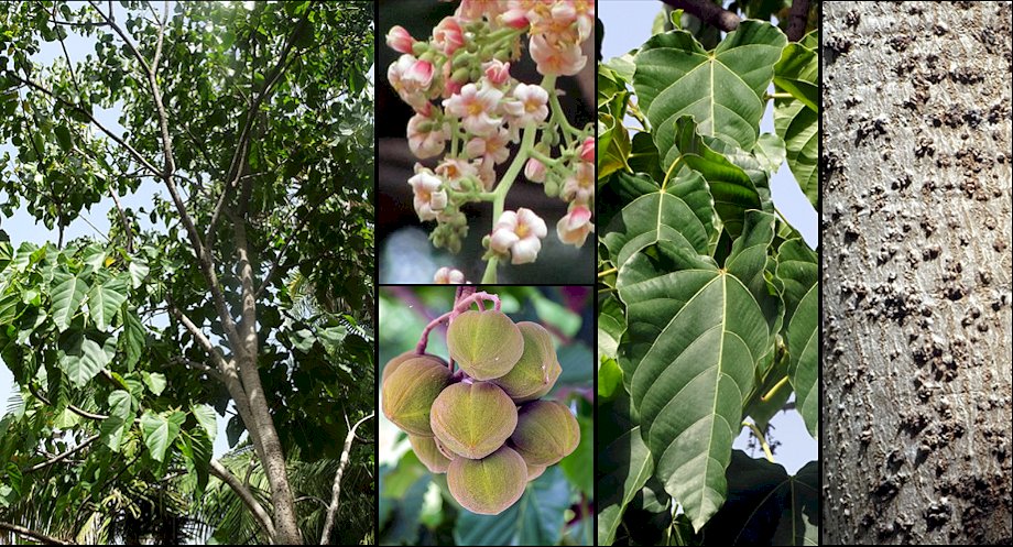 Descripción: Árbol siempreverde, generalmente monoico, de 10-15 m de altura, con la corteza grisácea o pardo-grisácea, lisa y con lenticelas más o menos abundantes. Hojas estipuladas, simples, alternas. Estípulas triangulares, acuminadas, de 4-6 mm de largo, pronto caedizas dejando bien las marcas. Lámina de ovada a cordada, de 8-28 x 7-22 cm, con la base fuertemente cordada con lóbulos redondeados o a veces truncada, el margen entero y el ápice de acuminado a cuspidado. Tienen textura membranácea, y son glabras y de color verde oscuro por el haz, y algo más claras y con algunos pelos en las axilas de los nervios por el envés. Nervadura basalmente palmatinervia, con 3-7 nervios, y pinnatinervia a lo largo del nervio medio, con 4-9 pares de nervios secundarios laterales. Pecíolo de 5-25 cm de largo, ligeramente acanalado o estriado mostrando generalmente un surco visible, con dos glándulas sésiles, discoides y cóncavas en el ápice. Inflorescencias tirsoides, terminales, tomentosas, bracteadas, con numerosas flores unisexuales, actinomorfas, blancas, sobre cortos pedicelos. Cáliz acampanado, rajándose hasta la mitad o la tercera parte de su longitud en 2-3 lóbulos iguales o desiguales, pubescentes externamente; corola con 5 pétalos libres, imbricados, obovado-espatulados, redondeados en el ápice, en las flores masculinas adnatos basalmente a la columna estaminal. Flores masculinas de 6-10 x 10-13 mm, con 8(-10) estambres en 2 verticilos y unidos en una columna serícea, los externos con los filamentos libres y los internos con los filamentos adnatos en la base. Flores femeninas de 7-8 x 8-10 mm, con un ovario súpero, de ovoide a subgloboso, trígono o tetrágono en sección transversal, con 3-4 lóculos y 1 óvulo por lóculo; estilos divergentes, bífidos o trífidos. Frutos capsulares, subglobosos, lisos o rugosos, velutinosos, con 3-4 crestas longitudinales, de color marrón claro cuando están secos, de 3,5-5,5 x 3-5 cm. Semillas sin carúncula, discoideas, dorsiventralmente comprimidas, lisas, de color marrón, de 22-32 x 22-28 mm. Cultivo y usos: Requiere de un clima tropical o subtropical, libre de heladas, aunque puede aguantar algún frío ocasional una vez desarrollado, de suelos bien drenados, con un pH de 5-8, y de una exposición soleada o con media sombra, con aporte de riegos más o menos espaciados. Se multiplica por semillas, teniendo un crecimiento rápido. El aceite producido por las semillas era utilizado en Filipinas para la producción de un jabón suave que formaba espuma en el agua de mar. Tiene usos medicinales, utilizándose dicho aceite externamente para tratar enfermedades parasitarias de la piel, quemaduras, escaldaduras y heridas. La savia de la corteza se utiliza para curar la caspa de la cabeza. Los frutos son tóxicos, y sus semillas pueden provocar vómitos violentos o fuertes diarreas. La UICN lo ha clasificado con el estado de conservación 'Vulnerable'. |
