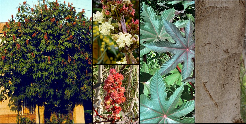 Descripción: Planta herbácea anual o perenne, monoica, que en climas cálidos o tropicales se torna leñosa y puede adquirir porte de arbusto o de un arbolito de 3-5(-7) m de altura, con un solo tronco o ramificada desde abajo, con los tallos verdes, rojizos o glaucos, huecos y nudosos y la corteza del tronco lisa y de color castaño claro. Estípulas unidas formando una lámina membranácea que, al caer, deja una marca circular en el tallo. Hojas alternas, peltadas, de 10-60 cm de diámetro, palmatilobadas, con 6-9 (-11) lóbulos de anchamente ovados a lanceolados, el central de hasta 7-30 x 2-8 cm y los laterales progresivamente más pequeños, simétricos o no, con el ápice agudo y el margen glanduloso y dentado de forma irregular; son de textura firme, ligeramente cartáceas, de color verde oscuro por el haz y más pálidas por el envés, a veces algo rojizas o purpúreas; nervadura rojiza, con 15-25 pares de nervios laterales en el lóbulo central, disminuyendo en número en los lóbulos laterales. Pecíolo de 10-20(-30) cm de largo, con frecuencia rojizo. Inflorescencias en cimas axilares o subterminales de 10-30 cm de largo, con brácteas lanceoladas de 8-10 mm de largo, verdes teñidas de rojo. Flores masculinas en la parte inferior, sobre pedicelos articulados de 5-17 mm de largo, con un cáliz membranáceo de 3-5 sépalos ovados, de color verde amarillento, de 5-8 x 3-5 mm, sin pétalos, con numerosos estambres cremosos o amarillentos unidos en grupos. Flores femeninas en la parte superior, sobre pedicelos articulados que se alargan en la fructificación, con un cáliz de 5 sépalos lanceolados de 4-5 mm de largo, rojizos, sin pétalos, con un ovario aculeado, trilocular, conteniendo un óvulo por lóculo; estilos 3, rojizos, de 2-5 mm de largo, libres o unidos ligeramente en la base, bífidos. Frutos trígonos, aculeados, de 1-1,8 x 1-1,5 cm, rojizos o glaucos, separándose en 3 cocos bivalvos monospermos. Semillas comprimido-ovoides, jaspeadas de marrón y blanco, carunculadas, de 7-12 x 5-8 mm.. Cultivo y usos: Planta que requiere cultivarse en zonas libres de heladas, en suelos de mediana fertilidad y bien drenados y en una exposición soleada. Se multiplica por semillas, que deben remojarse 24 horas en agua caliente antes de la siembra. De sus semillas, que son muy venenosas, se obtiene el llamado “aceite de ricino”, que se utiliza en medicina como purgante. Existen cultivares de jardinería muy ornamentales, tales como ‘Zanzibarensis’, de hojas verdes con la nervadura blanca, ‘Sanguineus’, con hojas y tallos rojizos, ‘Gibsonii’, de menor porte y con tallos y hojas purpúreas con brillos metálicos, ‘Red Spire’, con los tallos rojizos y las hojas con tintes bronceados. Es una planta invasora. |