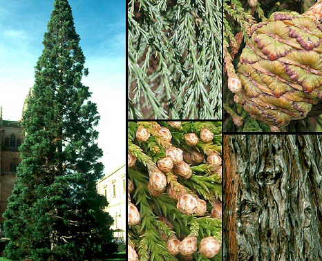 Descripción: Árbol de gran talla, que puede alcanzar los 100 m de altura, aunque sin superar a las secoyas rojas. Corteza muy gruesa, fibrosa, profundamente agrietada, ligera, de color marrón rojizo. Copa estrecha y piramidal en las primeras edades, con ramificaciones primarias inclinadas hacia abajo. Con la edad se hace irregular. Hojas diferentes sobre las ramillas largas y sobre las ramillas cortas. Sobre las ramillas largas son aleznadas, con la base ensanchada. Sobre las ramillas cortas son aleznadas y con ápice puntiagudo, rígido, no recurvado hacia el ramillo, de 3-8 mm de longitud. Su color es verde oscuro. Conos ovoides de 4-8 cm de longitud, tardando dos años en madurar y persistiendo después varios años en el árbol. Escamas leñosas con escudete rugoso, con una depresión y una punta caediza en dicha depresión. Cultivo y usos: Vegeta bien en zonas altas con humedad atmósférica. Se multiplica por semillas, que deben estratificarse durante 30-40 días. Las variedades se multiplican por injerto. Requiere suelos profundos y frescos, no vegetando en los calizos. Se utiliza como ejemplar aislado. |