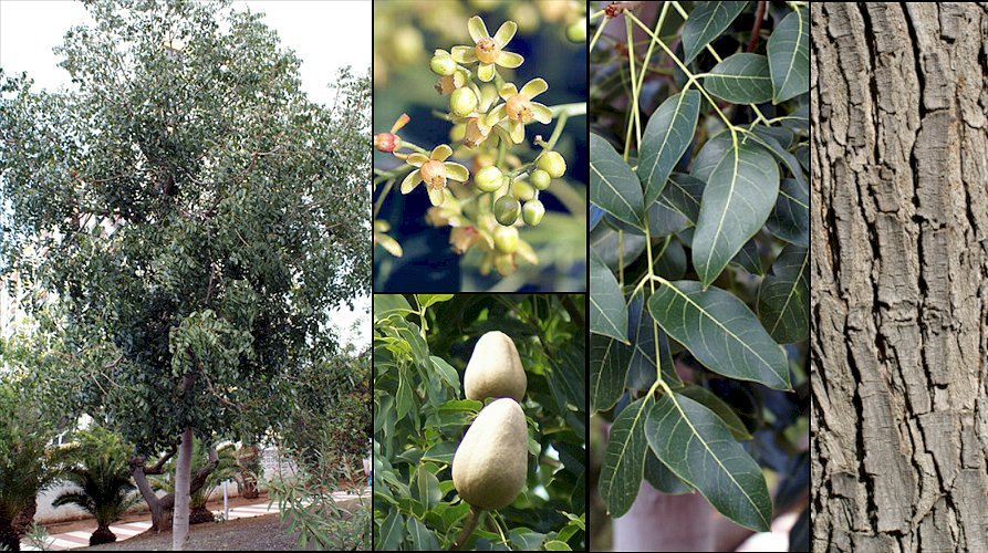 Descripción: Árbol siempreverde o semicaducifolio por muy poco tiempo, de 20-25 m de altura, con una copa redondeada, simétrica y muy ramificada y un tronco recto con la corteza grisácea y lisa cuando es joven, pasando a castaño oscura, fisurada y escamosa con la edad. Hojas alternas o agrupadas, glabras, de 12-15(-25) cm de largo, paripinnadas, portando 2-4(-5) pares de folíolos opuestos, ovado-lanceolados a ovado-elípticos, de 4-8 x 1,5-3,5 cm, con la base muy oblicua, aguda o redondeada, el margen entero y el ápice largamente acuminado; son de textura coriácea, glabros, de color verde oscuro por el haz y verde más claro por el envés, rojizos en las nuevas brotaciones. Nervadura con 8-10 pares de nervios secundarios laterales. Pecíolo glabro, de hasta 6 cm de largo, con la base ligeramente hinchada. Inflorescencias en panículas axilares, glabras, de 8-15 cm de longitud. Flores unisexuales, pudiendo haber de los dos sexos en la misma inflorescencia, pequeñas, regulares, blanquecinas o amarillo-verdosas, sobre pedicelos de 1,5-3 mm de largo. Cáliz en forma de copa, con 5 lóbulos anchamente redondeados de 1-1,5 mm; corola con 5 pétalos ovado-oblongos, de 3-4 mm de largo. Androceo con 10 estambres unidos formando un tubo de 2,5-3 mm de largo, con anteras sésiles en su extremo. Ovario súpero, de cónico a ovoide, con 5 lóculos; estilo más largo que el ovario, glabro; estigma disciforme. Frutos en cápsulas leñosas erectas, sobre largos pedúnculos, de ovoides a subglobosas, de 6-10 cm de largo, marrones, dehiscentes por 5 valvas. El centro del fruto es una columela gruesa, leñosa y pentagonal que se extiende hasta el ápice, del cual cuelgan las semillas superpuestas y sujetas por sus alas. Generalmente hay 35-45 semillas por fruto, y son de color marrón oscuro, de 4-6 cm de largo, comprimidas, aladas apicalmente para su dispersión por el viento. Cultivo y usos: Requiere climas suaves, con temperaturas mínimas de 10-12 °C, así como suelos bien drenados, profundos, ricos y más bien arenosos, no prosperando en suelos pobres ni en zonas áridas. Se multiplica por semillas sin tratamientos. Como árbol ornamental no debe plantarse en aceras por su sistema radicular. Su madera es mucha calidad, utilizándose en la fabricación de muebles y ebanistería de alta gama, así como en revestimientos interiores. Se emplea en la construcción naval, a menudo como madera decorativa y como contrachapado para tablones y cubiertas. Es muy adecuada para trabajos de carpintería de precisión como maquetas, cajas de instrumentos, relojes y piezas de instrumentos musicales. Otros usos menores incluyen tallas de madera y juguetes. De las semillas se puede extraer un aceite que podría tener cierto valor comercial, y la corteza se ha utilizado para teñir y curtir cuero. |