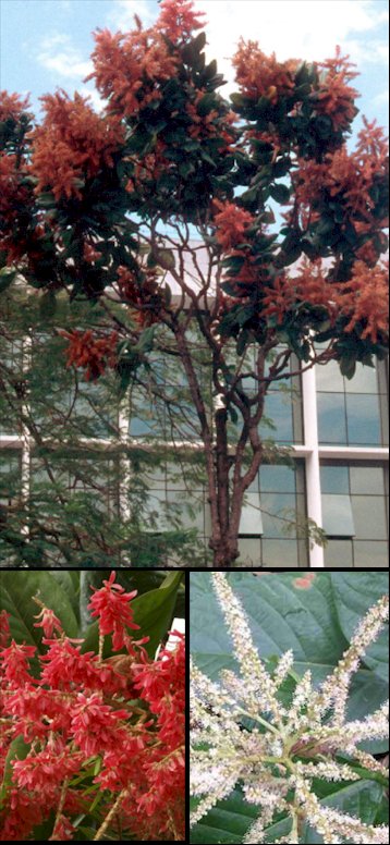 Descripción: Arbolito caducifolio dioico, de (5-)10-20 m de altura (en nuestras latitudes crece poco), con una copa cerrada más o menos piramidal y un tronco con la corteza lisa, grisácea. Yemas glabras, más raramente pubescentes, de color castaño, estriadas. Estípulas de 10-12 cm de largo, dejando una marca prominente al caer. Hojas alternas, de ovadas a oblongas, de 15-40 x 7-20 cm, con la base redondeada o aguda, ligeramente atenuada, el margen entero y el ápice abruptamente acuminado. Son de textura cartácea, de color verde oscuro, glabras, a veces hirsutas en los nervios del envés; nerviación con 20-30 pares de nervios laterales bastante próximos y bien marcados. Pecíolo de 1-2,5(-4) cm, recto, acanalado, glabro o piloso. Inflorescencias con los ejes densamente velutinosos con pelos amarillentos, formadas por espigas dispuestas en fascículos laxos. Flores masculinas sésiles o subsésiles, con un perianto de 6 tépalos estrechamente ovados, de 2 x 1 mm, ligeramente unidos basalmente. Estambres 9, con los filamentos de unos 2 mm, ligeramente adnatos a los tépalos. Flores femeninas sobre un pedicelo tomentoso de 2-5 mm de largo en la fructificación, con un perianto de 6 tépalos distribuidos en dos series muy diferentes, los 3 exteriores unidos basalmente formando un tubo oblongo-urceolado de 8-15 mm de largo, pubescente, cuya parte libre se alarga en la fructificación constituyendo 3 alas rojizas, oblanceoladas, pubérulas, de ápice redondeado, de 20-35 mm de largo; los 3 interiores mucho más pequeños y de lineares a ovados. Ovario trígono, con 3 estilos de 3-4 mm de longitud. Fruto en aquenio envuelto por el tubo del perianto, de ligeramente trígono a redondeado basalmente, de 6-10 x 3-5 mm, de color castaño amarillento, más o menos asurcado, glabro. Cultivo y usos: Planta tropical que requiere para su cultivo de climas suaves, pues sus grandes hojas se hielan con relativa facilidad, especialmente en los árboles jóvenes, una exposición soleada y suelos bien drenados, ácidos o neutros, con riegos que mantengan la humedad. Se multiplican por semillas. Su copa es un tanto desgarbada, al menos en nuestra zona. Los ejemplares masculinos carecen de la belleza de los femeninos, pero hasta que no florecen no podemos saber si son ejemplares de uno u otro sexo. Su madera no es demasiado resistente, utilizándose localmente en componentes de muebles, cajas, ebanistería, tableros, etc. En sus lugares de origen son árboles que viven en simbiosis con feroces hormigas (mirmecofilia). Puede ser especie invasora en condiciones favorables por la facilidad de dispersión de sus frutos. |