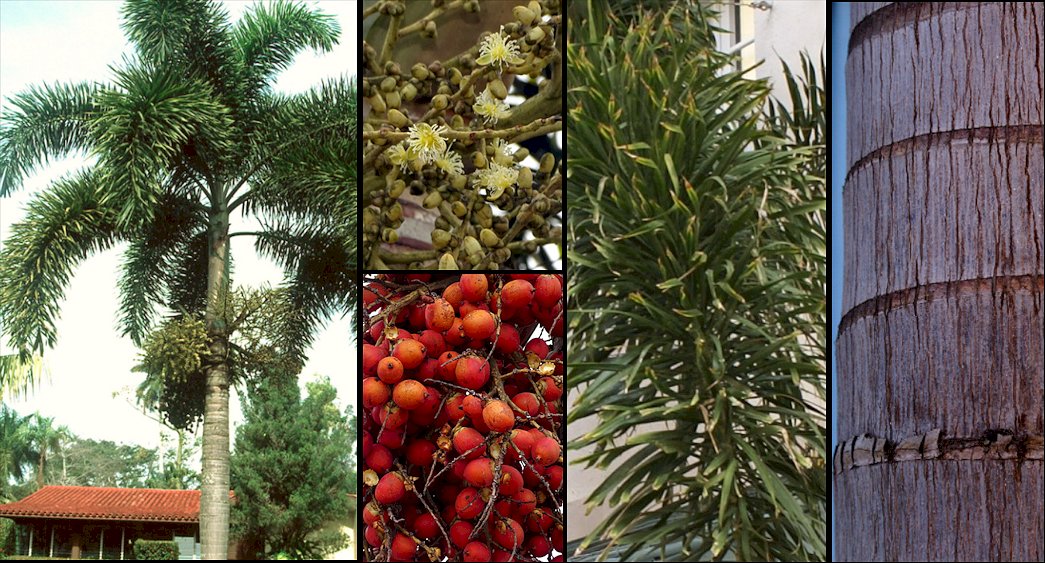 Descripción: Palmera monoica de tronco simple y capitel destacado, de 8-10(-15) m de altura y 15-20 cm de diámetro, con el tallo columnar de color gris claro, anillado con las marcas de las hojas. Vainas basales tubulares, de 80-120 cm de longitud, formando un capitel alargado, prominente, verde, cubierto de un tomento blanco-grisáceo. Hojas pinnadas, recurvadas, de 2,5-3,2 m de largo, con el pecíolo de 30-50(-90) cm de largo, grueso; folíolos 90-110 en cada lado del raquis, dispuestos en varios planos, lo que le da un aspecto plumoso a la hoja; folíolos de 45-70 x 2-4,5 cm, divididos en segmentos secundarios; los más cercanos a la base de la hoja son enteros o están divididos en 1-4 segmentos, número que va aumentando a medida que nos acercamos al centro de la hoja, pudiendo llegar a 11-17 segmentos, descendiendo paulatinamente de nuevo a medida que nos acercamos al ápice de la hoja, donde pueden tener 1-3 segmentos cada folíolo. Son de color verde brillante por el haz y más pálidos y con un brillo blanquecino por el envés. Inflorescencias de 75-110 cm de longitud, naciendo en la base del capitel (infrafoliar), con raquillas hasta de 4º orden. Pedúnculo de 8-13 cm de largo, con 5-6 brácteas caducas; profilo (espata basal de la inflorescencia) de unos 60 cm de largo. Raquillas de hasta 30 cm de largo y 5 mm de grosor. Flores de ambos sexos en la misma inflorescencia, sésiles, en triadas de 1 flor femenina y 2 masculinas. Las masculinas de unos 25 mm de diámetro en la antesis, con 3 sépalos de 5-6 x 3-4 mm, verde-cremosos, glabros; pétalos 3, de 9-10 x 5 mm, verde-cremosos, glabros. Estambres 58-72, de hasta 10 mm de largo. Flores femeninas con 3 sépalos de 6-7 x 5-7 mm, verdes, y 3 pétalos de 9-11 x 6-8 mm, igualmente verdes. Frutos globosos, con restos del estigma, de 5-6,5 x 3-6 cm, de color rojo anaranjado en la madurez. Semillas redondeadas, de 3 x 2,5 cm. Cultivo y usos: Se multiplica por semillas con facilidad, las cuales tardan 2-3 meses en germinar. Palmera muy elegante por su follaje plumoso que se adapta a varios tipos de suelos y situaciones, siendo de crecimiento rápido. Buena especie para formar composiciones o en alineaciones, de un aspecto muy tropical. |
