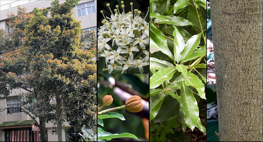 Descripción: Arbolito siempreverde, a veces arbustivo bajo ciertas condiciones, que puede alcanzar 10-15 m de altura en su lugares de origen, con una copa más o menos densa, globosa o algo extendida, y un tronco con la corteza marrón-grisácea, lisa y áspera cuando joven, fisurándose longitudinalmente con los años; ramillas cilíndricas, delgadas, puberulentas cuando jóvenes, con pelos estrellados amarillentos, glabrescentes. Hojas simples, alternas, de oblongas a elípticas, de 2,5-18 x 1,5-6 cm, con la base redondeada u obtusa, el margen entero y a veces algo ondulado y el ápice agudo o acuminado. Son de textura coriácea, glabras en ambas superficies, de color verde brillante en el haz y verde más pálido por el envés. Nervadura con 5-7 pares de nervios secundarios laterales. Pecíolo de 1-6 cm de longitud, engrosado en ambos extremos. Inflorescencias cimoso-corimbosas, terminales, muy densas, puberulentas, con pelos castaño-amarillentos. Flores bisexuales, actinomorfas, sobre pedicelos de 2-5 mm de largo, con el cáliz acampanado de 5-6 mm de largo, puberulento, con 5 sépalos anchamente ovados, unidos en la base, agudos en el ápice, de 1-2 mm de largo; corola rotácea, con 5 pétalos libres, extendidos, anchamente espatulados, de color blanco, de 7-10 x 3 mm. Columna estaminal alargada y largamente exerta, unida al ginóforo, formando un androginóforo de 1,5-2 cm de longitud, en cuyo ápice porta 15 anteras sésiles, aglomeradas formando una cabeza globosa de unos 2 de diámetro. Ovario globoso, sésil, pubescente, situado el ápice de la columna estaminal, con 5 lóculos y 2 óvulos en cada lóculo; estigma sésil. Fruto en cápsula oblongo-piriforme, algo leñosa, de 2,5-3 x 1,6-2 cm, densamente puberulenta, sobre un estípite de 2-4 cm de largo, con dehiscencia longitudinal en 5 piezas, cada una con 1-2 semillas oblongas, comprimidas, aladas, de 1,8-2 cm incluida el ala. Cultivo y usos: Árbol interesante cuando está en plena floración, que gusta de suelos razonablemente fértiles, bien drenados, y de una exposición protegida del sol intenso, especialmente las plantas jóvenes. Se multiplica por semillas. La madera es dura, fácil de trabajar y apta para la fabricación de muebles, paneles, palillos y cajas, siendo poco resistente a insectos y hongos. La corteza es resistente y se puede procesar para fabricar cuerdas, bolsas de arpillera y materiales para la fabricación de papel. El aceite de sus semillas se utiliza localmente en candiles. |