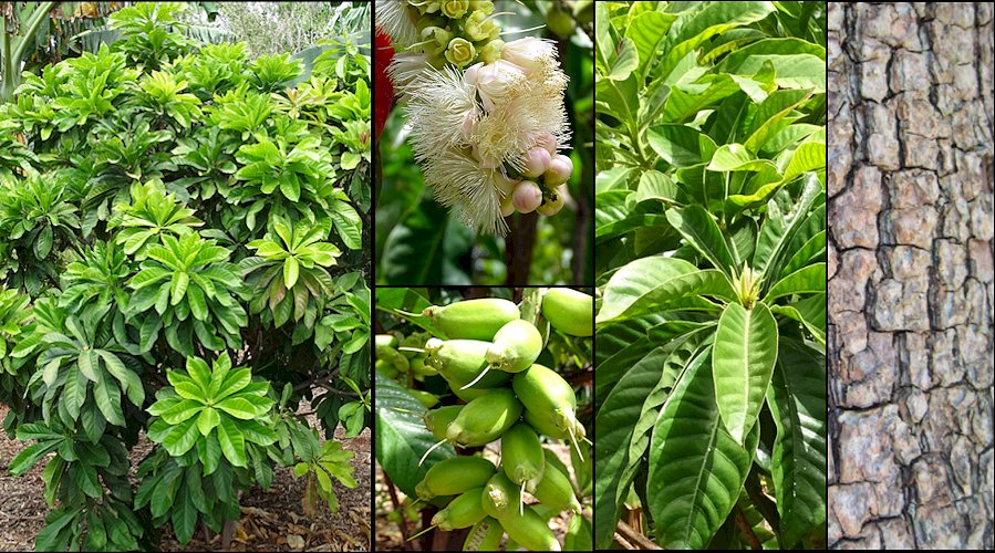 Descripción: Arbolito semicaducifolio de 7-10 m de altura, con una copa baja y redondeada y ramas gruesas, con la corteza de color marrón grisácea, que se fisura y cuartea con el paso de los años. Hojas agrupadas hacia el final de las ramas, de obovado-oblongas a obovado-lanceoladas, de 12-26 x 5-8 cm, con la base cuneada y decurrente en el pecíolo, el margen serrado-crenulado y el ápice agudo; son de textura cartácea, glabras, de color verde medio o verde claro, tornándose rojizas en invierno; el nuevo follaje brota con tonalidades rojo-cobrizas; nervadura destacada en ambas superficies, con 14-24 pares de nervios secundarios laterales, que se fusionan ligeramente antes de llegar al margen. Pecíolo de 3-10 mm de largo, más o menos alado por la base decurrente de la lámina foliar. Inflorescencias en espigas terminales y ramifloras, colgantes, de 15-27 cm de longitud, con muchas flores sobre un raquis pubescente de 2-4 mm de diámetro, acrescente en la fructificación, con brácteas y bractéolas linear-lanceoladas, puberulentas, caedizas, de 22-40 x 1,5-5 mm las primeras y 8-14 x 1-2 mm las segundas. Flores olorosas, sésiles, con un hipanto subtetrágono de 4-5 x 3-5 mm, verde o amarillento; cáliz de 3-5 lóbulos libres, desiguales, suborbiculares, de 10-15 x 10-15 mm, coriáceos, membranáceos y fimbriados en el borde; corola con 4 pétalos elípticos, convexos, de 20-30 x 12-20 mm, membranáceos, obtusos, blancos o rosa pálido. Androceo con numerosos estambres en 7 verticilos, siendo el más interno de estaminodios, con los filamentos blancos, de 20-30 mm de largo, los de los estaminodios de sólo 5-10 mm de largo. Gineceo con un ovario subtetrágono de 3-4 lóculos, conteniendo 3-6 óvulos en cada uno de ellos; estilo grueso, de 3-4,5 cm de largo. Fruto subtetrágono, de 5,5-6 x 1,75-2 cm, truncado en el ápice y estrechado en la base, con el mesocarpio y endocarpio fibrosos. Semillas ovoides, fisuradas, de 4,5 x 1 cm. Cultivo y usos: Requiere ser cultivado en zonas con clima tropical o subtropical, libres de frío, en suelos básicos y bien drenados, aunque vive bien en suelos bastante húmedos, bajo una exposición bien soleada, pues a la sombra crece más desgarbado, y al abrigo de los vientos, necesitando de riegos periódicos, especialmente cuando es joven. Si queremos tener un árbol denso y bien ramificado, es aconsejable desmocharlo al llegar su tronco a la altura deseada. Se multiplica por semillas, y también por esquejes de madera semidura con hormonas de enraizamiento. Su crecimiento es bastante rápido. |