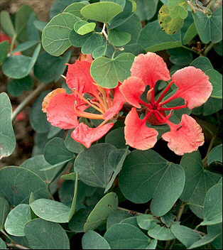 Descripción: Aunque puede ser un arbolito de 3-4 m de altura, normalmente es un arbusto vigoroso, algo trepador. Hojas bilobadas, de unos 7 x 7 cm, con la nervadura bien marcada en el envés, de color verde grisáceo. Flores de color rojo-salmón o rojo ladrillo, de unos 6-8 cm de diámetro, con los pétalos unguiculados, dispuestas en racimos terminales. Fruto en legumbre estrecha, de unos 10 cm de largo. Cultivo y usos: Se multiplica por semillas, que germinan bien. Es planta bastante resistente, soportando suelos pobres y secos. Interesante para utilizarla de forma rastrera cubriendo taludes. |