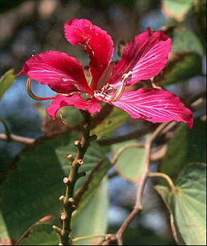 Descripción: Arbolito semicaducifolio de 4-5 m de altura, con ramas extendidas o algo colgantes. Hojas alternas, simples, suborbiculares, de 8-15 cm de longitud, con dos lóbulos agudos o redondeados, glabras. Pecíolo de unos 4 cm de longitud. Racimos laterales o terminales con flores de cáliz tubular y corola con 5 pétalos extendidos de color púrpura, el superior algo más oscuro. Androceo con 5 estambres de filamentos rosados. Fruto rara vez producido. Cultivo y usos: Se multiplica por esquejes o acodo aéreo ya que raramente produce semillas. Arbolito algo delicado al frío que requiere exposición soleada y suelos de tipo medio, bien drenados. La poda de formación le ayudará a adquirir su porte. Su flor es el emblema de Hong Kong desde 1965. |