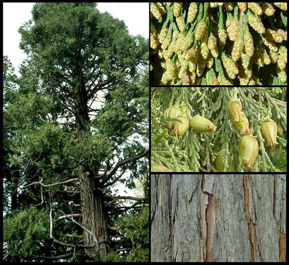 | Porte general de un ejemplar añoso (Jardín Histórico-Artístico El Bosque. Béjar. Salamanca. 2002) y detalle de los conos masculinos (mes de enero), de los conos femeninos (mes de julio) y de la corteza del tronco de Calocedrus decurrens, cuya resina, con un olor que recuerda al incienso, le proporciona su nombre popular de "cedro de incienso". |