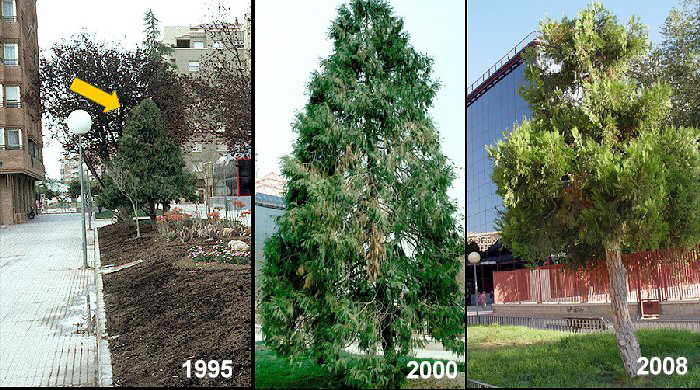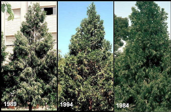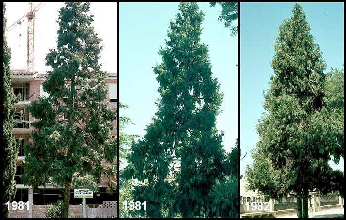 | A la izquierda un ejemplar de Calocedrus decurrens existente en 1989 en los jardines de la antigua Arrixaca, en la actualidad desaparecido. En el centro y a la derecha ejemplares existentes en el Arboreto del Valle, en sendas fotografías de los años 1984 y 1994. |