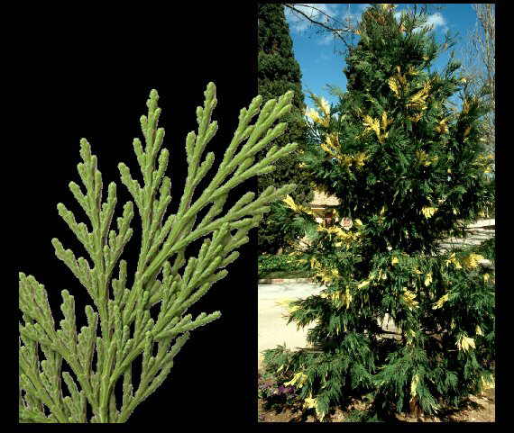 | Las hojas son de color verde oscuro, decusadas, imbricadas, con el par lateral cubriendo parcialmente al par frontal. En el cultivar 'Aureovariegata' (fotografía de la derecha) el follaje tiene retazos dispersos de color amarillo dorado. |