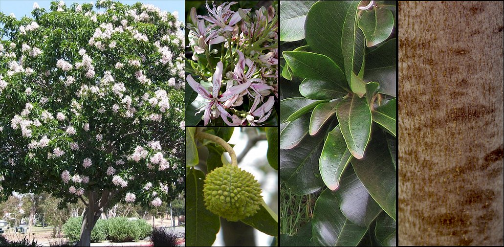 Descripción: Árbol siempreverde o semicaducifolio, dependiendo de las condiciones, de hasta 8-12 m de altura, con la copa generalmente extendida y un tronco recto con la corteza lisa y castaño-grisácea; ramillas inicialmente angulosas y pubescentes, más tarde glabrescentes, con cicatrices de las hojas, que son opuestas, decusadas, simples, sin estípulas. Lámina de elíptica a ovada u obovada, de 3,5-17 x 1,7-8,5(-10) cm, con la base asimétrica y cuneada, el margen entero, a veces algo ondulado, y el ápice agudo u obtuso y redondeado; son ligeramente pubescentes inicialmente, luego glabrescentes, de color verde oscuro brillante por el haz y algo más claro por el envés, y están salpicadas de glándulas oleíferas puntiformes; nervadura pinnada, más destacada por el envés, con numerosos nervios secundarios paralelos que forman casi un ángulo recto con el principal. Pecíolo algo achatado por el haz, ligeramente pubescente, de 2,5-6 mm de largo. Inflorescencias en cimas terminales ramificadas, hemisféricas, de 12-15 cm de diámetro, casi sésiles, portando flores bisexuales, sobre pedicelos de 10-16 mm de largo subtendidos por dos bractéolas aleznadas de 1,3-1,5 mm de largo. Cáliz con 5 sépalos ovados, de 3,5 x 1,8-2,5 mm, carnosos, ligeramente recurvados, verdes, persistentes. Corola con 5 pétalos estrechamente oblanceolados, de 3-4 cm x 5,5-6,5 mm, de color blanco o rosado, rojizos hacia la base, pubescentes. Androceo con 5 estambres fértiles, con los filamentos purpúreos, exertos, y las anteras oblongas con una glándula apical; alternan con 5 estaminodios de aspecto de pétalos y opuestos a ellos, erectos, estrechamente oblanceolados, de color rosa claro con puntos rojizos o purpúreos. Ovario súpero, con 5 lóculos con 2 óvulos cada uno, verde, peloso, sobre un ginóforo de 4,5-7 mm de largo; estilo recto, cilíndrico, de 10-11 mm de largo, rojizo o purpúreo; estigmas 5, adpresos, triangulares. Fruto en cápsula leñosa de 3-4,5 cm de diámetro, dehiscente por 5 valvas, de superficie verrucosa, marrón en la madurez, conteniendo 5-10 semillas redondeadas o angulosas, de 15-21 x 10-15 mm, de color negro brillante, recordando a una castaña. Cultivo y usos: Árbol que requiere de suelos profundos y bien drenados, medianamente fértiles, de una exposición soleada y de riegos en las épocas de más calor y crecimiento. Es sensible a las heladas, por lo que requiere de climas templados, y también le perjudican los vientos fuertes. Se multiplica por medio de esquejes en verano con uso de hormonas, o por medio de semillas que deben ser sembradas en primavera. Tiene una fase juvenil larga, por lo que no florece hasta pasados 6-7 años, y su crecimiento es más bien lento. Su madera es resistente y se utiliza en construcción y fabricación de muebles. |