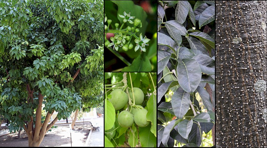 Descripción: Árbol siempreverde de 6-10 m de altura, con la copa muy ramificada y ancha y el tronco grueso y generalmente ramificado a poca altura, con la corteza lisa, al principio verdosa o de color gris oscuro, con estrías longitudinales y numerosas lenticelas blanquecinas, cuarteándose con el paso de los años. Ramillas finamente pubescentes al principio, luego glabras, cubiertas de lenticelas. Hojas alternas, dispuestas en espiral, largamente pecioladas, digitadas, normalmente con (3-)5(-7) folíolos de elípticos u ovales a anchamente ovados, de 5-20 x 3-8 cm, con la base cuneada o redondeada, a veces algo asimétrica, el margen entero o diminutamente dentado, a veces algo ondulado, y el ápice agudo o acuminado. Son de textura papirácea o cartácea, de color verde brillante y glabros por el haz, y algo más claros y con alguna pubescencia en los nervios por el envés. Los folíolos nuevos son al principio algo rojizos o bronceados. Nervio medio más destacado en el envés que en el haz. Pecíolo de 4-14 cm de longitud; pecíolulos de 0,5–1,7 cm de largo, generalmente vellosos. Inflorescencias en panículas terminales y axilares de hasta 10 cm de largo, pubescentes, con flores hermafroditas o unisexuales por aborto, sobre pedicelos de hasta 5 mm de longitud. Cáliz verdoso, cupuliforme, con 4-5 lóbulos ovados, ciliados; corola con 4-5 pétalos de 3-5 x 1,5-2 mm, amarillo-verdosos, oblongos, cóncavos, glabros. Androceo con los estambres alternando con los pétalos, con filamentos de 2-3 m de largo, glabros, de color crema verdoso. Ovario súpero, con 5 lóculos, glabro, con estigma lobulado. Las flores masculinas con un ovario rudimentario y las femeninas con anteras indehiscentes. Fruto sobre un grueso pedúnculo de 5-8 mm de largo, drupáceo, redondeado u ovoide, simétrico o irregular, de hasta 10-12 cm de diámetro, glabro, con la piel delgada de color verde amarillento y la pulpa cremosa, dulce y perfumada en la madurez. Semillas 2-5 por fruto, de 1,8-2,5 cm de diámetro. Cultivo y usos: Árbol subtropical que requiere climas libres de heladas. Prefiere suelos bien drenados, neutros o ligeramente ácidos, aunque tolera muchas situaciones, en una exposición soleada. Aunque una vez establecido tolera la sequía, gusta de algún riego profundo de cuando en cuando para que su sistema radicular profundice. Es necesaria alguna poda inicial de formación para dirigir su copa. Se multiplica por semillas, que deben ser frescas, y también por injerto. Especie cultivada por sus frutos, que se consumen en fresco y se venden en los mercados locales. El fruto es rico en vitaminas A y C, y posee un alto contenido de carbohidratos y proteínas. Al parecer la corteza, las hojas y sobre todo las semillas contienen un glucósido que tiene propiedades hipnóticas y sedantes. Se utiliza en medicina popular en caso de insomnio y dolores reumáticos. En dosis altas puede ser mortal. La madera es compacta y de resistencia media, aunque no muy durable, empleándose en ocasiones en carpintería. |