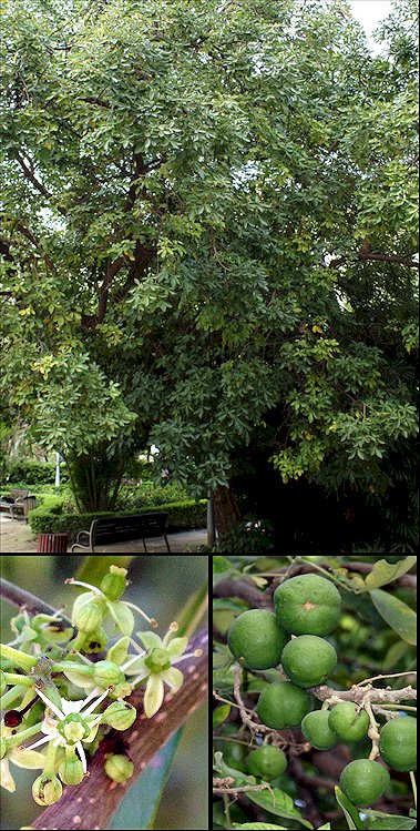 Descripción: Árbol siempreverde de 6-10 m de altura en cultivo en nuestra zona, sin espinas, con la copa redondeada, las ramas gruesas y un tronco más bien corto, con la corteza de color marrón claro que se torna verrucosa con los años. Hojas alternas, palmaticompuestas, de 18-24 cm de longitud, con (3-4-)5 folíolos cortamente peciolulados, de oblongo-ovados a elípticos, de 6-15 x 2,5-5 cm, siendo el central el de mayor tamaño, con la base cuneada, el margen entero, a veces algo ondulado o crenulado, y el ápice abruptamente acuminado. Son de color verde brillante y glabros por el haz, y más pálidos y densa y suavemente pubescentes por el envés. Pecíolos de 5-12 cm de largo. Flores en racimos o panículas axilares o laterales generalmente más cortas que los pecíolos, con los ejes puberulentos o pubescentes y brácteas diminutas, portando flores blanco-verdosas o cremosas sobre pedicelos pubescentes de 1-2 mm de largo. Las flores son actinomorfas, bisexuales, aunque a veces se comportan como masculinas por aborto del ovario o como femeninas por la esterilidad de los estambres, convertidos en estaminodios. Cáliz con 4-5 sépalos cortos y anchamente triangulares, soldados en la base; corola con 4-5 pétalos oblongo-elípticos, mucho más largos que los sépalos, libres, valvados, carnosos, agudos en el ápice. Estambres en las flores masculinas o bisexuales en número igual al de pétalos y alternando con éstos, libres, con anteras sin apéndices. Ovario súpero, presente sólo en las flores femeninas o bisexuales, con 4-5 lóculos y un estigma sésil con 5 divisiones. Fruto en drupa de aspecto pomiforme, pues recuerda a una manzana verde, globoso, de 8-10 cm de diámetro, de color verde amarillento, con una piel fina y una pulpa blanquecina comestible, conteniendo 4-5 pirenos oblongos, cada uno con una semilla. Cultivo y usos: Su fruta, aunque es comestible y tiene un sabor agradable, es poco apreciada porque existe la creencia generalizada de que no es saludable (matasano) porque se ha extraído de las semillas y de las hojas un glucósido que tiene un efecto soporífero, y de ahí la creencia de que comer la fruta provoca somnolencia. Su madera tiene una densidad media y una textura bastante fina, fácil de trabajar, no siendo resistente ni a la descomposición ni a los insectos. Tiene aplicaciones medicinales en problemas gastrointestinales. Al igual que C. edulis, requiere de climas libres de heladas, prefiere suelos bien drenados, neutros o ligeramente ácidos, aunque tolera otras muchas situaciones, y una exposición soleada. Se multiplica por semillas o por injertos. |