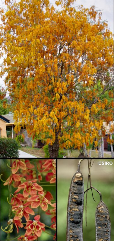 Descripción: Árbol siempreverde o semicaducifolio dependiendo del clima, algo variable, de 7-10(-20) m de altura, con la copa redondeada o extendida y ramificada irregularmente, y un tronco normalmente solitario, con la corteza castaño grisácea, rugosa y con numerosas lenticelas, fisurándose verticalmente con el paso de los años. Ramillas inermes, de color castaño oscuro, glabras, lisas, algo estriadas hacia el extremo. Hojas pinnadas, alternas, variables, de 10-25 cm de largo, glabras o tomentosas, con el pecíolo de 2-3,5 cm de largo, engrosado en el punto de inserción, y el raquis de 8-20 cm de longitud, portando 2-9 pares de folíolos generalmente opuestos, más o menos espaciados, de lanceolados a oblongos u obovados, de 2-11 x 1,5-3 cm, con la base redondeada, ocasionalmente desigual, el margen entero y el ápice redondeado o emarginado; son de textura media, de color verde brillante o verde grisáceo por el haz y más pálidos por el envés, con un peciólulo de 3-4 mm de largo y el nervio medio visible por el envés. Inflorescencias en racimos colgantes más o menos densos, de 7-20 cm de largo, que brotan de la madera vieja, portando hasta 50 flores que van abriendo de arriba a abajo. Flores de 10-25 mm de diámetro, sobre pedicelos de 2-3 cm de largo, acompañadas de brácteas y bractéolas que persisten hasta la antesis. Cáliz con 5 sépalos ovados, de 5-6 mm de largo, obtusos, pelosos externamente, de color verde claro inicialmente pasando a crema con el tiempo; corola con 5 pétalos estipitados, estrechamente ovados, obtusos o redondeados, glabros, de 5-15 mm de largo, erectos y luego extendidos, de anaranjados a rojizos por delante, pasando a amarillentos al ajarse, y de amarillos a anaranjados por detrás. Androceo con 10 estambres o con 7 estambres y 3 estaminodios; 3 de los estambres tienen filamentos de 13-14 mm de longitud, sigmoides, con una zona engrosada y carnosa cerca del centro; 4 de ellos alternan con los anteriores y tienen filamentos de 7-8 mm de largo; los estaminodios tienen filamentos aún más cortos. Estilo acanalado o con 4 ángulos longitudinalmente, de 16-18 mm de largo. Fruto en legumbre cilíndrica o algo comprimida, de 25-30 x 2 cm, glabra o diminutamente pubescente, de color marrón oscuro o casi negra en la madurez, con marcas transversales entre las semillas. Semillas ovoides, gruesas, de color castaño grisáceo, de 11 x 8 mm. Cultivo y usos: Requiere un clima suave, libre de heladas, una exposición soleada y suelos franco arenosos, bien drenados, desde ligeramente ácidos a neutros o ligeramente alcalinos, con riegos durante el periodo de crecimiento. En zonas 10 a 11. Se multiplica por semillas, que requieren de tratamientos previos, como el escarificado, para acelerar y favorecer la germinación. Su crecimiento es de lento a moderado. La madera es dura y de grano denso, con interés para algunos muebles y para la construcción en general. Por su belleza en floración entendemos que debería estar más extendido su uso en jardines. |