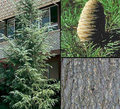Descripción: Árbol de gran talla que puede alcanzar hasta 70 m de altura, con porte piramidal. La corteza es gris oscura, resquebrajada en escamas irregulares. Ramificaciones colgantes. Acículas largas, de 50 mm o más de longitud, de color verde plateado, estrechas. Cono erecto, ovoide, de 7-12 cm de longitud, con ápice redondeado. Cultivo y usos: Se multiplica por semillas y las variedades por injertos. Posee una excelente madera, muy duradera, que desprende un agradable aroma y se utiliza en construcción. Son frecuentes los cultivares: Argentea, Aurea, Compacta, Fastigiata, Pendula, Glauca. |