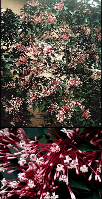 Descripción: Arbusto o arbolito siempreverde de 3-4 m de altura, con los tallos rojizos, glabros, tetragonales hacia el ápice. Hojas opuestas, pecioladas, de lanceoladas a ovado-lanceoladas, elípticas u oblongas, de 12-25 x 3,7-12 cm, de base redondeada, margen entero y ápice cortamente acuminado; son de color verde por el haz con los nervios rojizos y generalmente de color púrpura oscuro por el envés, suavemente pelosas por ambas caras. Inflorescencias en densas panículas terminales. Cáliz urceolado, carnoso, de color púrpura, de 8-10 mm de largo, con 5 dientes; corola con un tubo muy delgado, de 7-8 cm de longitud, de color blanco o rosa intenso, acabado en 5 lóbulos oblongo-elípticos, de hasta 1,5 cm de largo, recurvados. Androceo con los estambres muy sobresalientes, con los filamentos blancos y las anteras negro-purpúreas. Fruto drupáceo, elipsoide, de 1-1,5 cm de longitud, de color púrpura, con el cáliz persistente rojizo, conteniendo 4 pirenos. Cultivo y usos: Arbolito o arbusto espectacular cuando está en plena floración, que requiere para su cultivo un clima benigno, libre de fríos, una exposición soleada o a media sombra, suelos bien drenados, fértiles, y riegos suficientes, no tolerando la sequía. Tiene la particularidad de emitir muchos chupones de raíz, utilizándose éstos para su multiplicación y siendo, por ello, especie potencialmente invasora. En España es una planta muy rara de ver. |