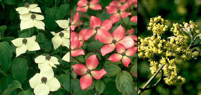 | Cornus kousa, Cornus kousa 'Satomi' y Cornus mas |