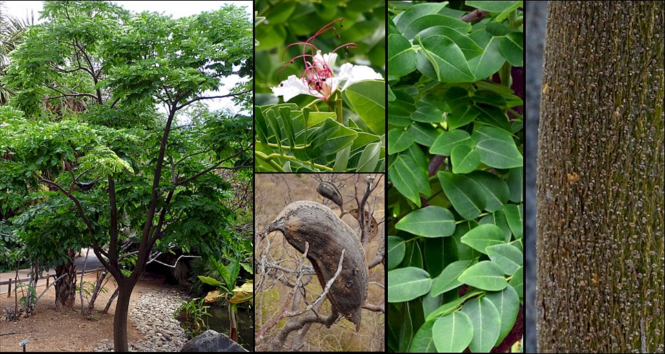 Descripción: Árbol caducifolio de 4-20 m de altura, con una copa ramificada y extendida y un tronco grueso y columnar, de hasta 100 cm de diámetro, ocasionalmente algo estrechado hacia la base, con la corteza lisa, formada por una capa exterior delgada de color gris pálido con grietas verticales poco profundas y que a veces se descama dejando ver una capa inferior marrón rojiza o verdosa. Hojas pinnadas, con 2-4 pares de pinnas, cada una de las cuales porta 4-8 pares de folíolos alternos, ovados u ocasionalmente elípticos, de 15-55 x 8-34 mm, con la base redondeada o ligeramente cordada y el ápice obtuso; son de textura cartácea, glabros, de color verde brillante por el haz y más pálidos por el envés. Inflorescencias en racimos axilares que forman corimbos laxos, apareciendo al mismo tiempo que las hojas, con los ejes y pedicelos glabros. Flores blancas cambiando a amarillentas, de 5-8 cm de diámetro, con pétalos unguiculados, blancos, el central con una mancha central amarilla, con las uñas rojizas y con los estambres y el estilo de color rojo granate. Cáliz con 5 sépalos de 12-17 mm de largo, extendidos, verde y glabros externamente y cremosos y pubescentes internamente: corola con 5 pétalos de 2,5-4,5 x 1,8-3,6 cm, con el margen crispado , estrechándose abruptamente en la base en una uña larga. Estambres bien exertos, con filamentos de 6-8 cm de longitud y anteras de 2,5 mm de largo. Ovario lanoso hacia la base, verdoso. Legumbre muy larga, gruesa y leñosa, suberecta, de 20-35 x 5,5-8 cm, picuda apicalmente, a veces con un borde resaltado a lo largo de las suturas, de color marrón negruzco en la madurez, fracturándose en segmentos transversales estrechos o, a veces, dehiscente por 2 valvas, conteniendo de 4 a 9 semillas de subesféricas a ovoides, de 15-23 x 12-18 mm, a veces con manchas marrones. Datos de cultivo: Especie bastante variable que requiere de suelos bien drenados y de una exposición soleada, si bien soporta la sombra parcial. Aunque durante sus primeros años necesita de algunos riegos, tolera bastante bien la sequía una vez establecido. Es sensible a las heladas y a temperaturas persistentes por debajo de los 3-5 grados centígrados. Especie polinizada por polillas debido a la apertura nocturna de sus flores. Se multiplica por semillas, que deben someterse a inmersión en agua antes de la siembra, y también al parecer por esquejes. La especie se utiliza localmente para obtener carbón, y con sus troncos ahuecados se hacen canoas. De su resina se obtiene una especie de pegamento. Se utiliza localmente como árbol ornamental en las ciudades. Especie clasificada de preocupación menor en la lista roja de especies amenazadas de la UICN. |